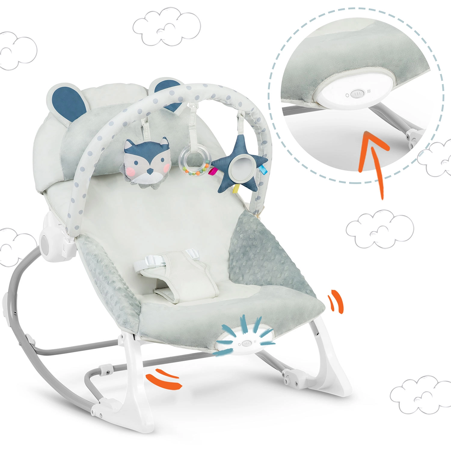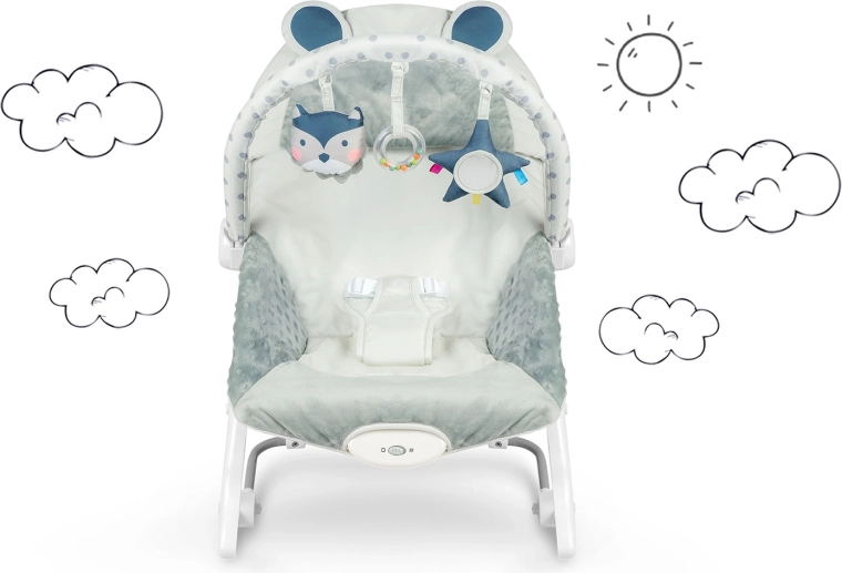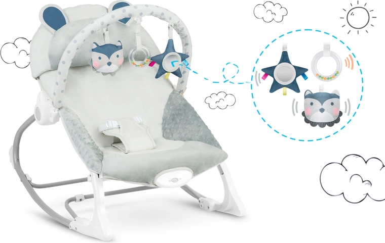 Pomirjujoč ritem guganja in izbirna vibracijska funkcija pomagata dojenčku sprostiti se in hitreje zaspati, medtem ko imate vi proste roke za nujne opravke. Odstranljiv lok s šumečimi plišastimi igračami in obročkom spodbuja vid in dotik, hkrati pa ga lahko preprosto prilagodite – igrače lahko premeščate ali zamenjate za priljubljene.