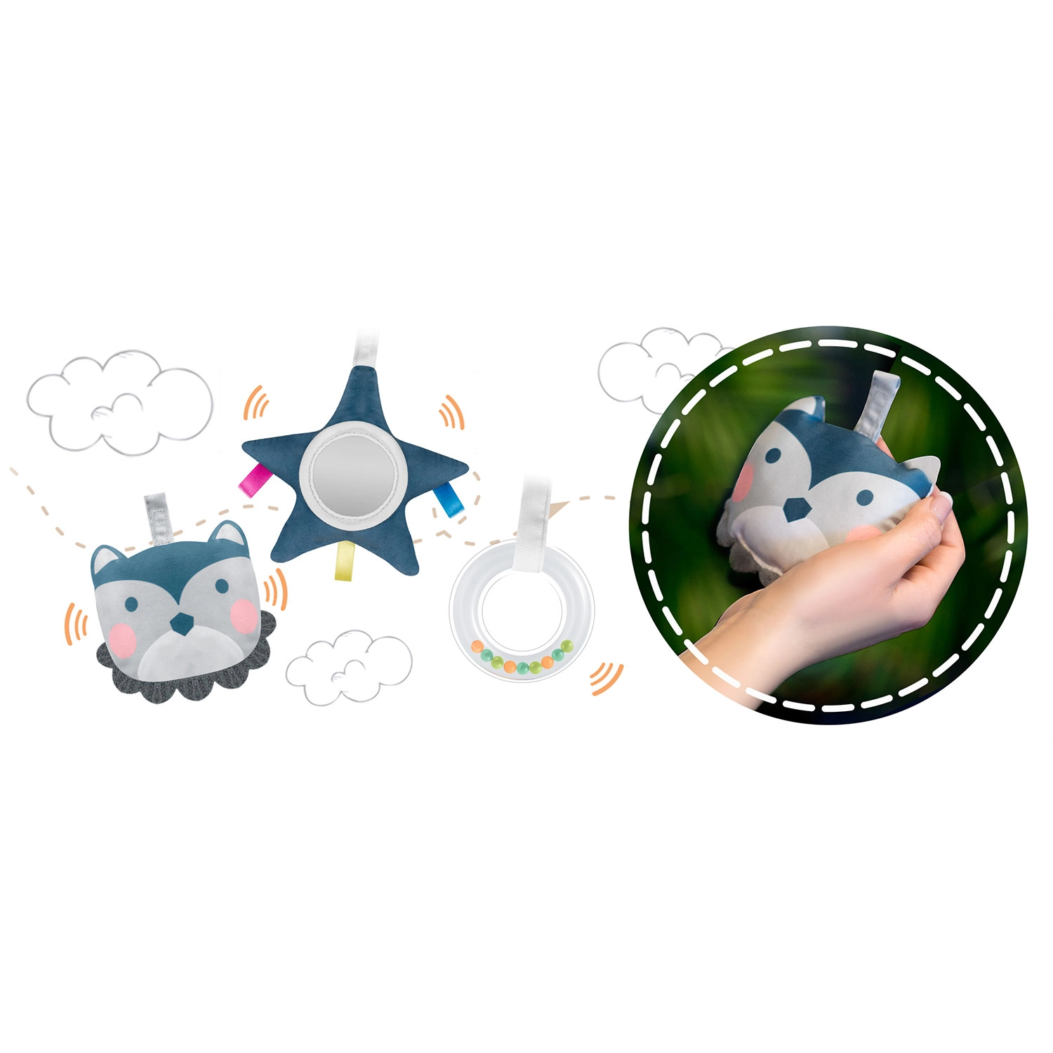 Odstranljiv lok s šumečimi igračami, obročkom in varnim ogledalcem spodbuja vid, dotik in koordinacijo. Igrače lahko enostavno preuredite ali zamenjate.