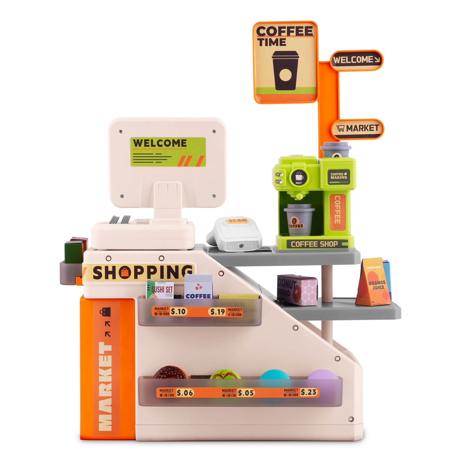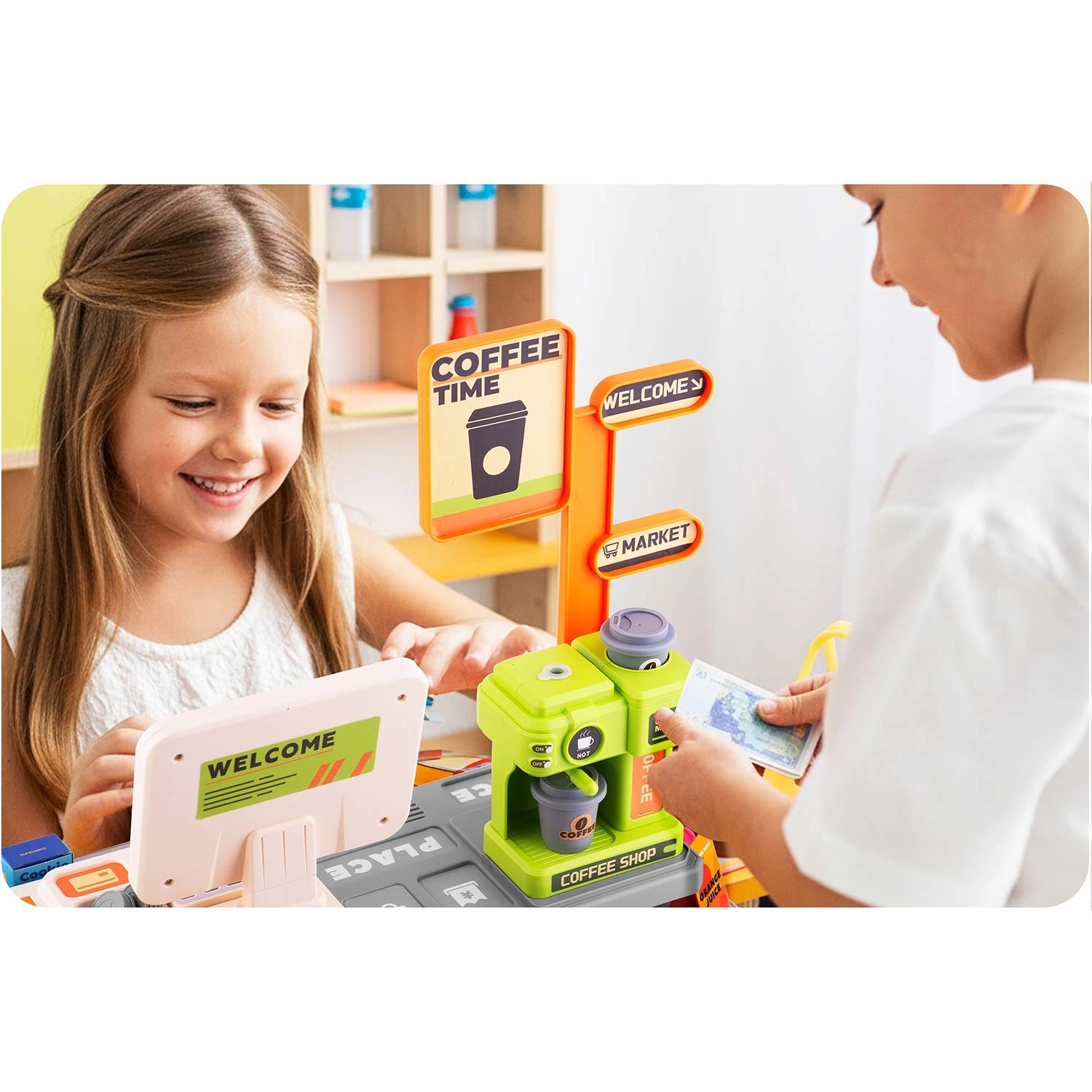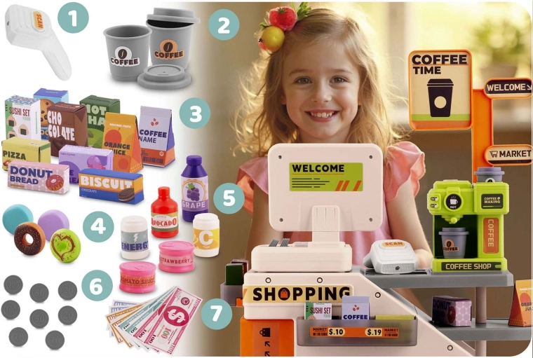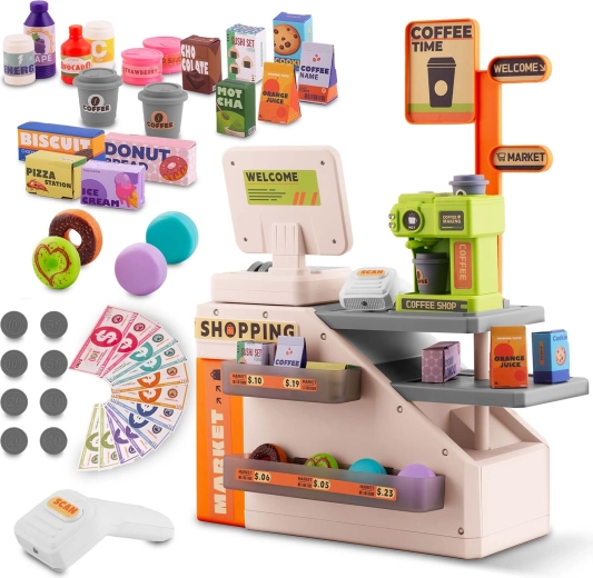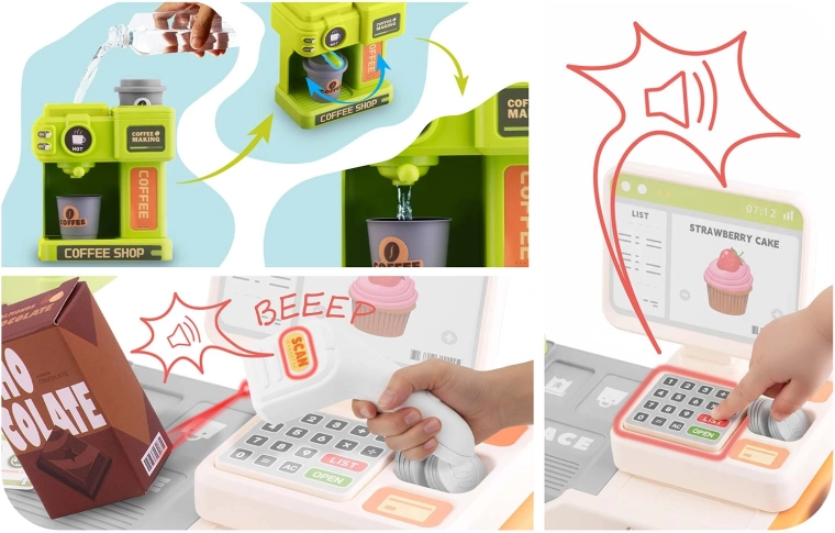 Ta barvita in funkcionalna blagajna s kavarno spodbuja otroke k raziskovanju socialnih vlog ter razvija domišljijo. Zahvaljujoč skenerju z rdečo diodo, gumbom z zvoki in kavnemu aparatu, ki ga je mogoče napolniti z vodo za »pravo« kavo, bodo otroci uživali v realistični igri trgovine in barista.
