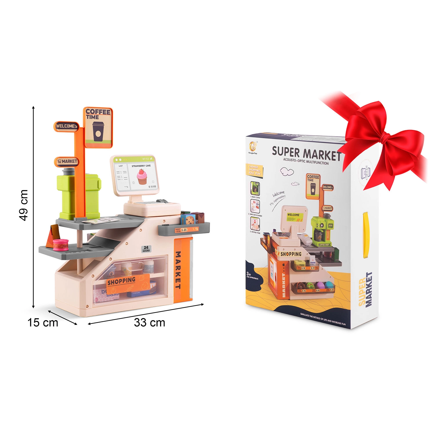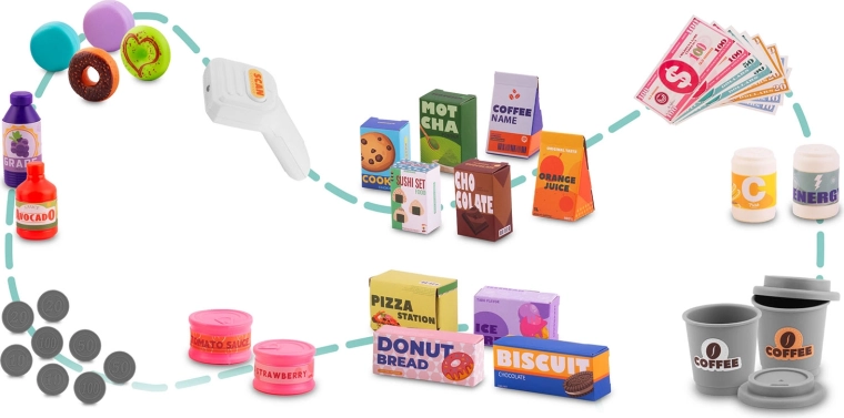 Priložena je množica dodatkov: papirnati bankovci, plastični kovanci, škatlice z živili, piškoti, pločevinke in steklenice. Odpirajoči se pult in shranjevalni predali pomagajo ohranjati red, medtem ko izrazite barve in zaslon blagajne pritegnejo pozornost in podpirajo učenje skozi igro.