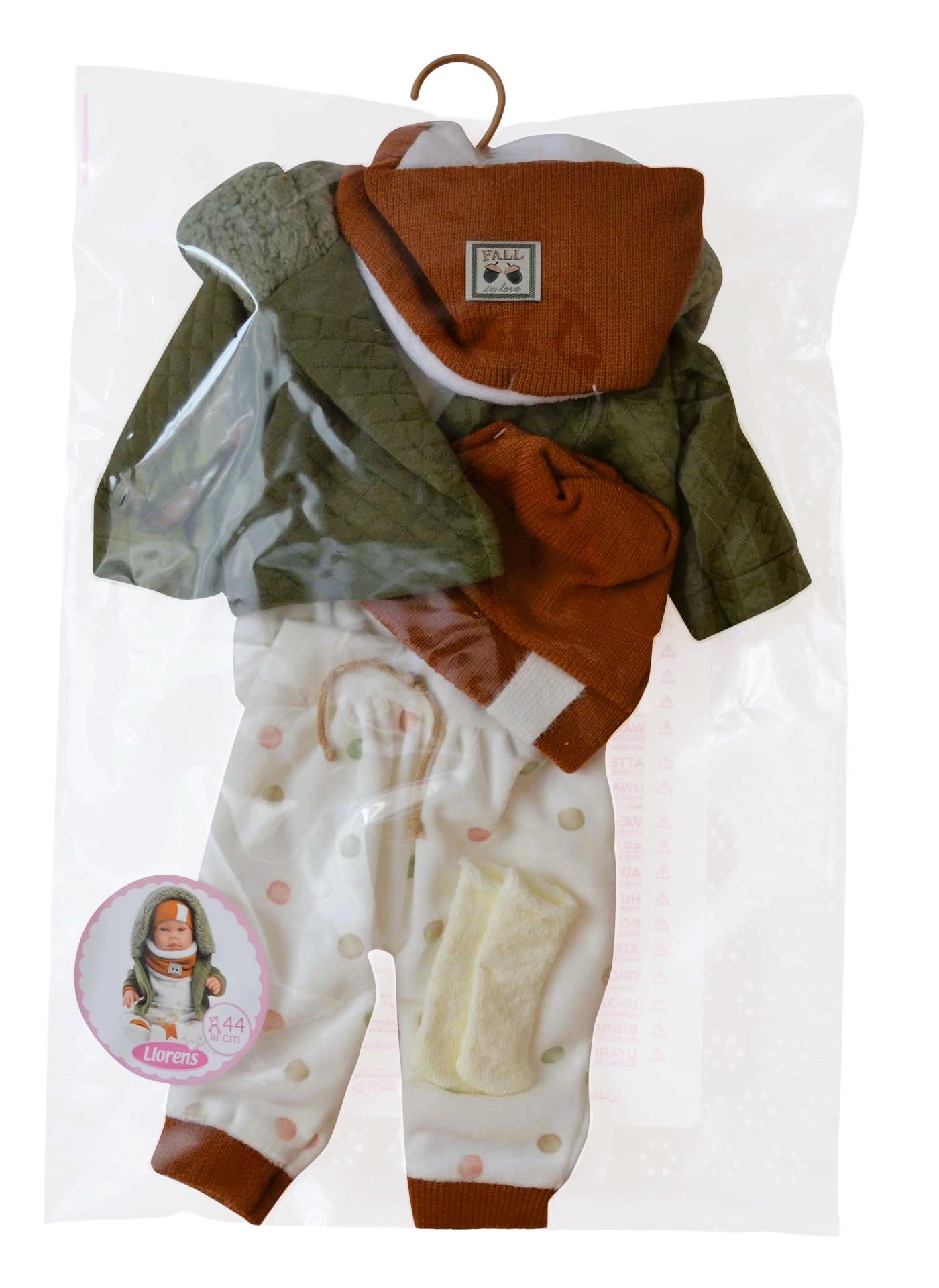 Stilski 6-delni komplet oblačil za punčko New Born v velikosti 43–45 cm spremeni vsako igro v realističen doživetje. Komplet je ročno izdelan v Španiji, zato izstopa po kakovosti in podrobnostih. Praktično pakiranje z obešalnikom olajša shranjevanje. Idealno za otroke od 3 let.