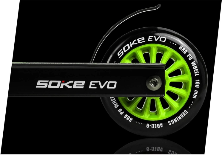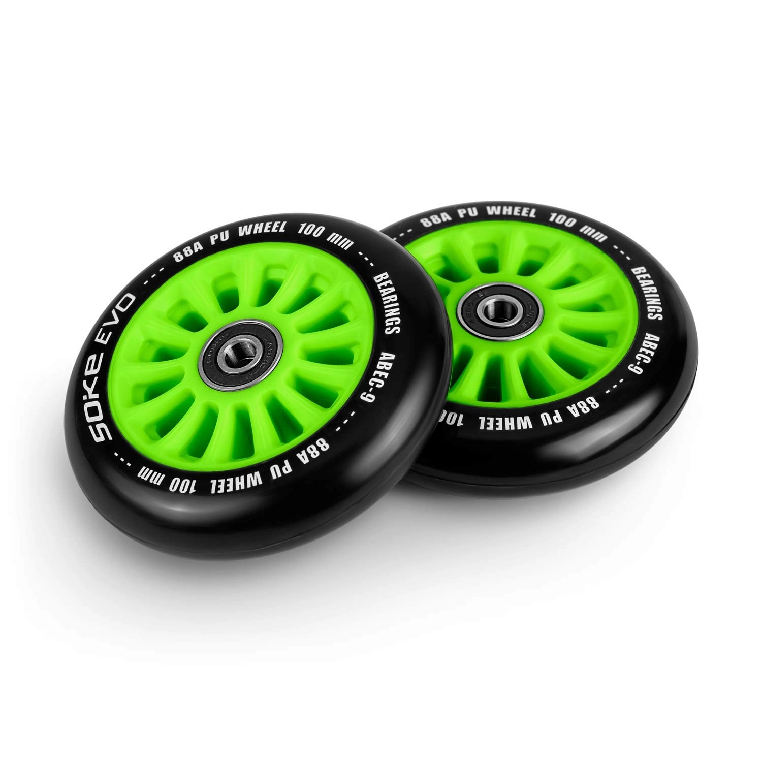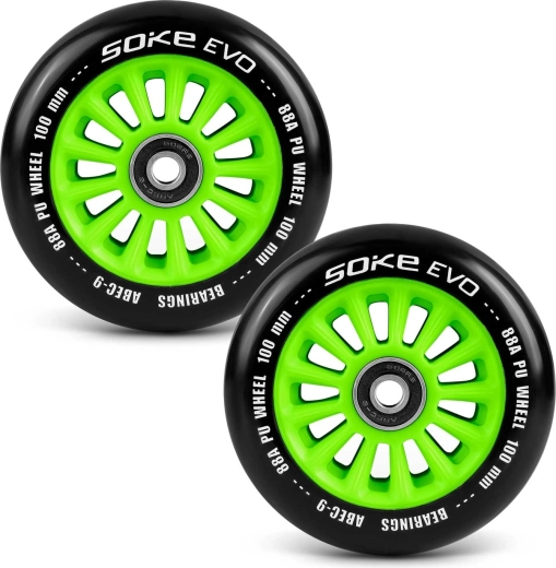 Vizualno izrazito zeleno jedro kolesu doda športen videz in hkrati poudari kakovostno izdelavo. Standardni premer 100 mm in os 8 mm zagotavljata široko združljivost z mnogimi modeli freestyle in mestnih skirojev.