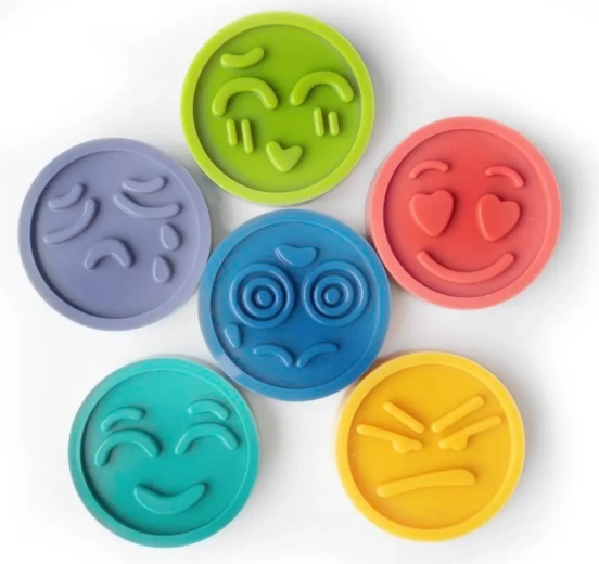 Šest izrazitih diskov z obrazi čustev pomaga otrokom prepoznavati in poimenovati občutke – temelj za razvoj empatije in socialnih veščin.