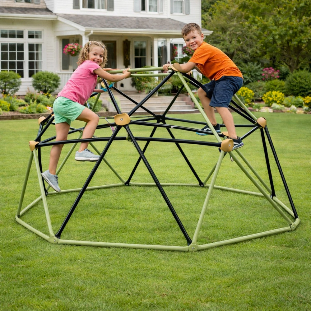 Otroška plezalna kupola za vrt ponuja stabilno, odporno in varno konstrukcijo za aktivno igro na prostem. Geodetska zgradba iz prašno lakiranega jekla s protizdrsnimi ročaji spodbuja razvoj moči, koordinacije in ravnotežja. Enostavno jo postavite na travo, pesek ali drugo ravno površino, brez potrebe po sidranju.
