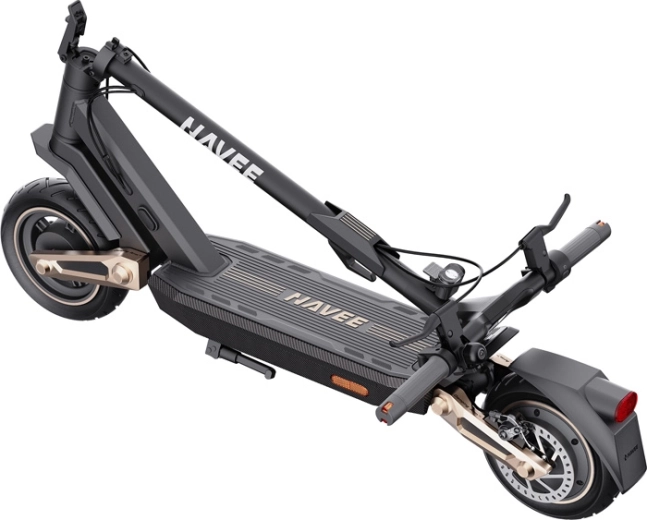 Brezzračne 10" pnevmatike z gelnim slojem bolje kljubujejo predrtjem, široko krmilo in ergonomski naklon 5° zmanjšujeta utrujenost rok, razširjena stopna plošča pa povečuje stabilnost. Pametna oprema vključuje Apple Find My, samodejno odklepanje/blokado glede na bližino telefona ter upravljanje v aplikaciji NAVEE – vključno s statistiko voženj, rekuperacijo in samodejnim vklopom luči.