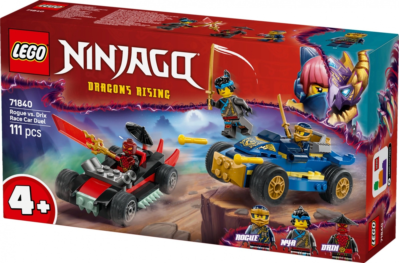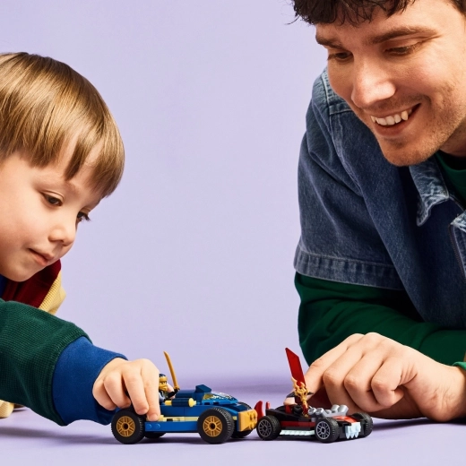 Ta barvit set, navdihnjen s 3. sezono serije NINJAGO: Vzpon zmajev, prinaša vse za adrenalinske zasledovalne vožnje in bitke. Otroci zgradijo ninđa avto z izstreljevalniki in vozilo zlikovcev ter se takoj podajo v igro zahvaljujoč začetni kocki, ki pospeši in poenostavi prve korake.