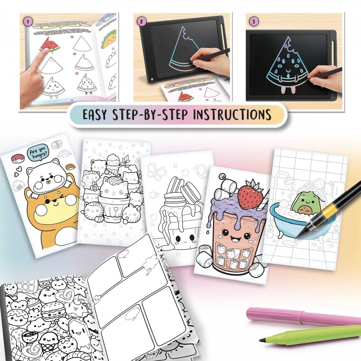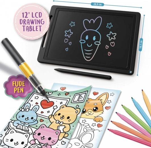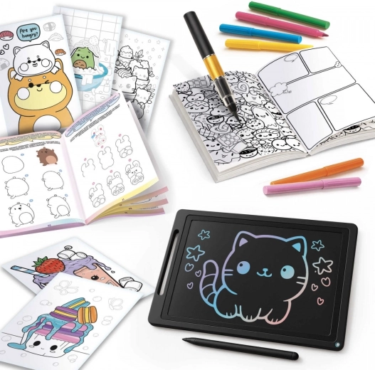 Kids Art – Kawaii laboratorij je igriv in navdihujoč komplet za otroke, ki obožujejo ljubko estetiko kawaii. Zahvaljujoč sodobni LCD tablici lahko otroci svobodno vadijo poteze, preizkušajo nove ideje ter znova in znova rišejo – brez zapravljanja papirja. Priloženi čopičasti flomaster Fude Pen in barvni flomastri omogočajo ustvarjanje gladkih zaobljenih oblik ter izrazitih mimik likov in živalic.