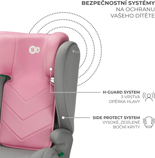 Za zaščito skrbi kombinacija sistemov H-GUARD (3-slojni vzglavnik) in SPS (okrepljene bočnice), ki pomagajo absorbirati energijo trka ter ščitijo otrokovo glavo, vrat, ramena in hrbtenico. Vzglavnik nastavite z eno roko v 10 stopnjah, zato sedež raste skupaj z otrokom. Za višje otroke lahko odstranite naslonjalo in ustvarite jahač 140–150 cm s preverjeno skladnostjo po R129.