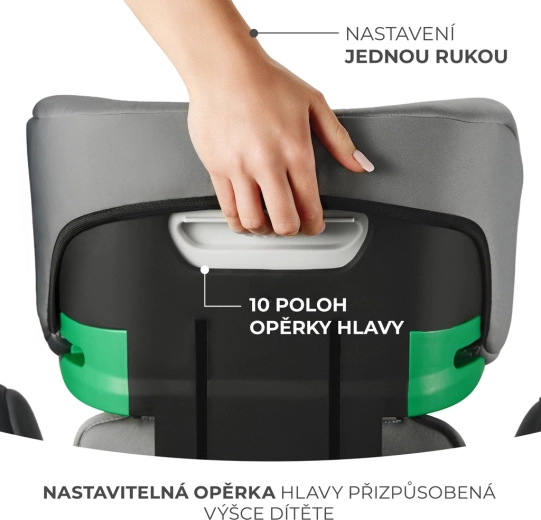 Vzglavnik nastavite z eno roko v 10 stopnjah. Za starejše otroke (140–150 cm) se lahko odstrani naslonjalo in uporablja udoben, odobren jahač.