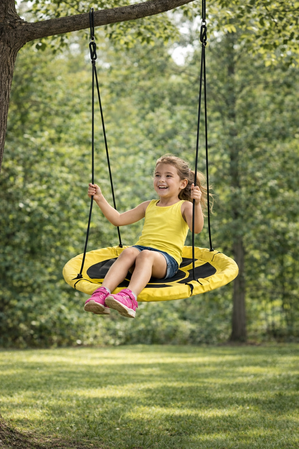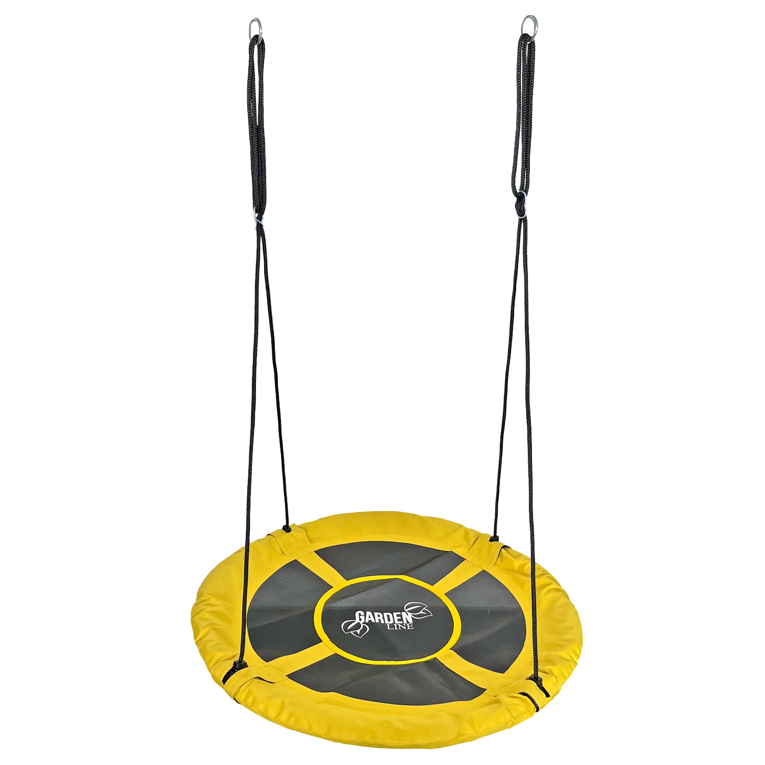 Rumen gugalnik gnezdo takoj poživi vsako dvorišče ali vrt. Širok, udoben sedež z vzdržljivo površino in oblazinjenim robom je stabilno obešen na štirih vrveh, zato se lahko otroci varno gugajo sede ali leže. Premer 100 cm nudi dovolj prostora za enega ali več otrok.