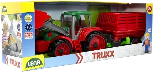 Predstavljamo vam Lena Truxx traktor z vozom, idealno igračo za male kmete. Ta plastični traktor izstopa s svojim robustnim dizajnom v rdeči in zeleni barvi, ki ga dopolnjuje funkcionalna zajemalka in odstranljiv voz. V kabini traktorja je nameščena mala figurica voznika, ki igri dodaja realističnost.
