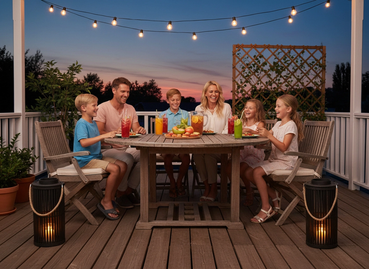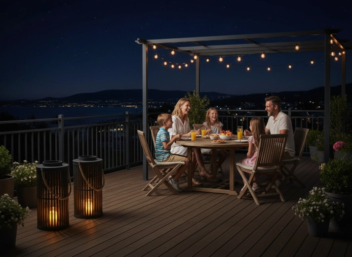 Odličen za balkone, pergole in vrtne mize. Praktičen ročaj omogoča enostavno prenašanje in obešanje.
