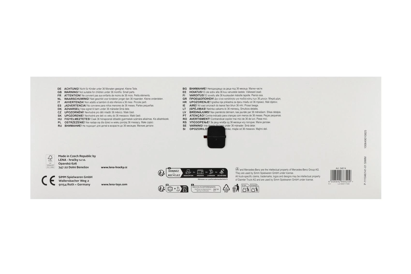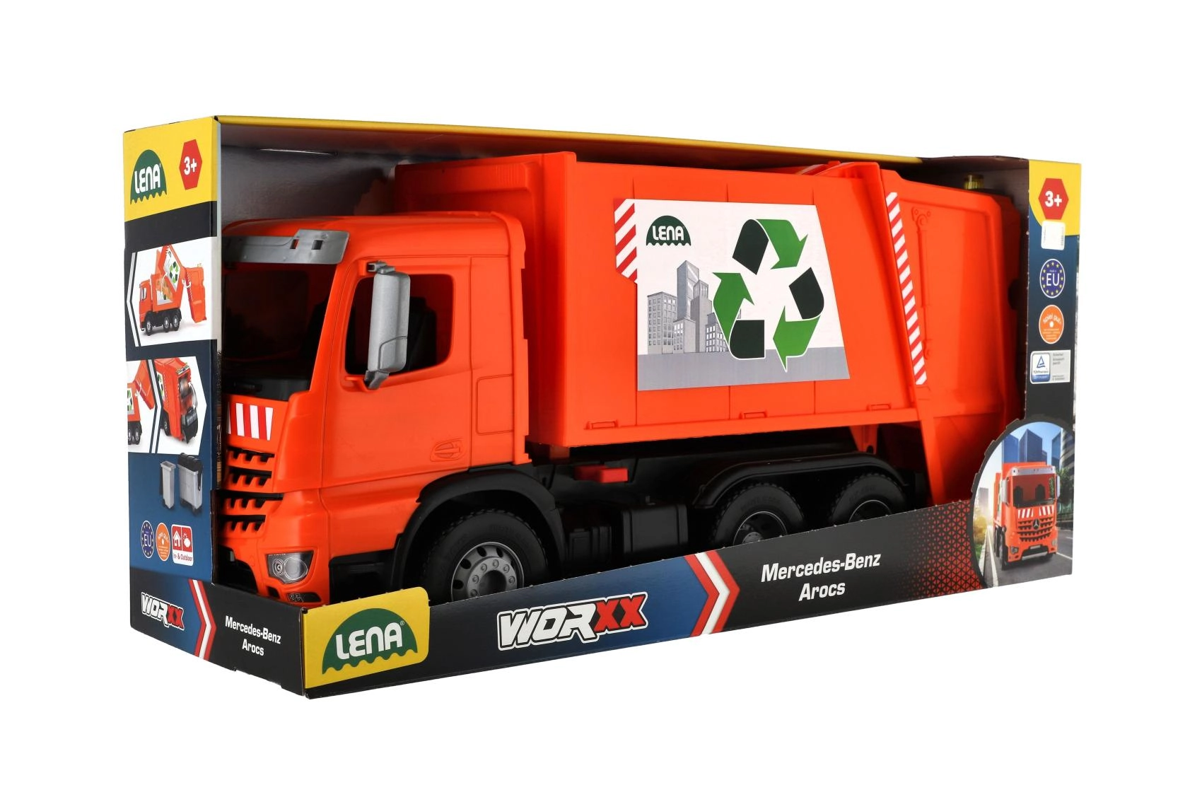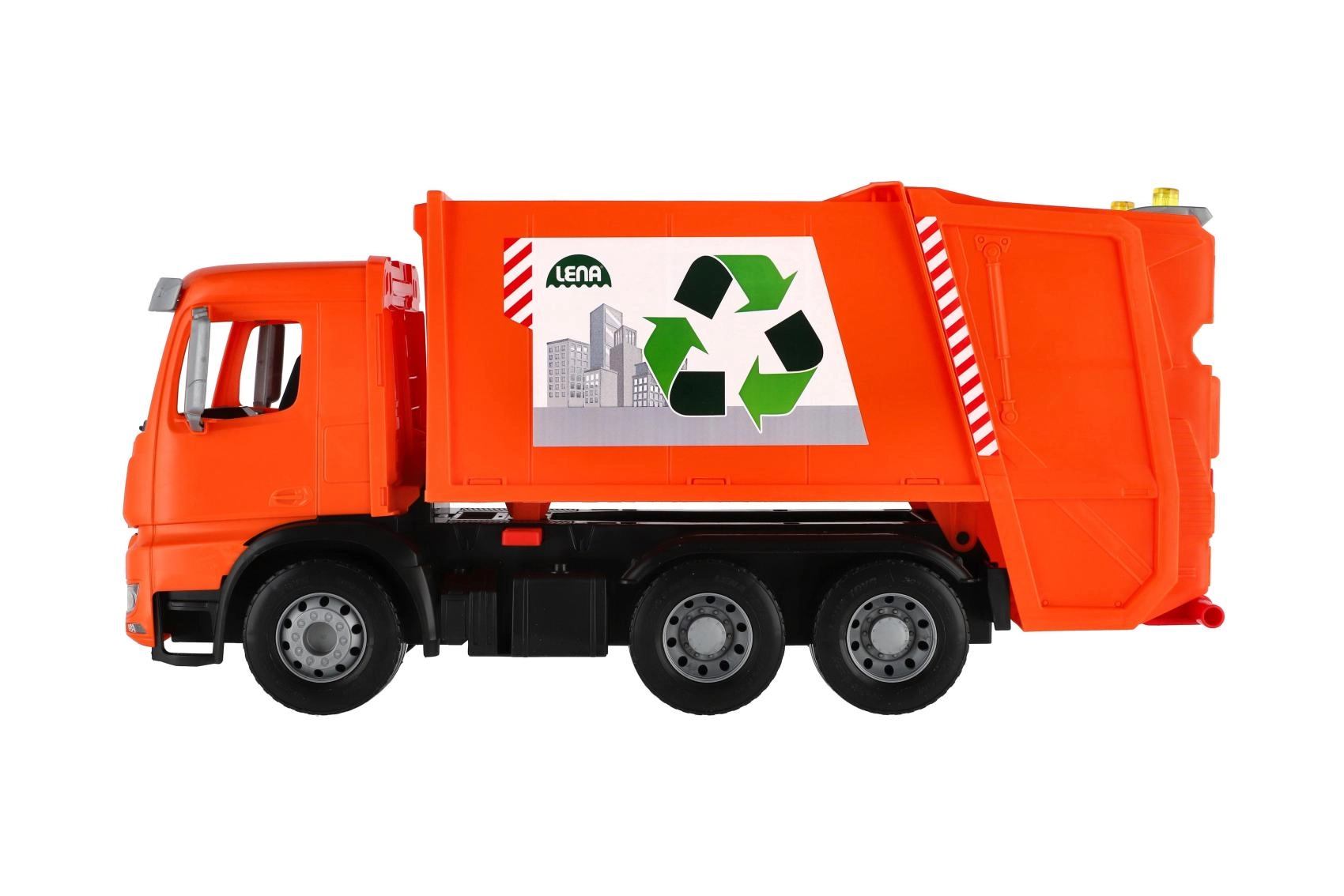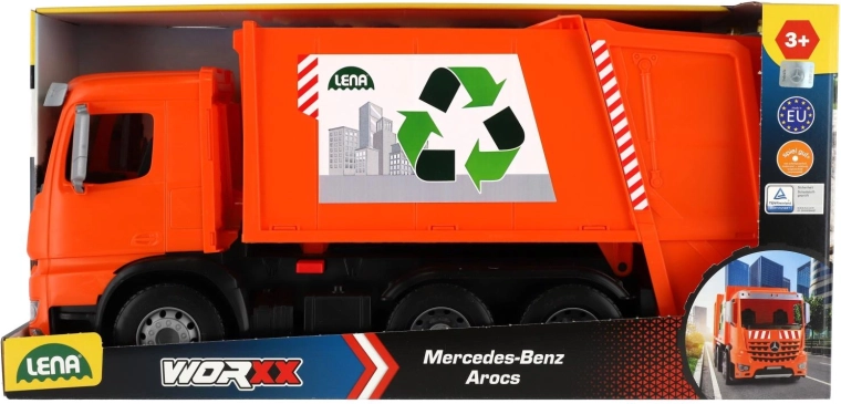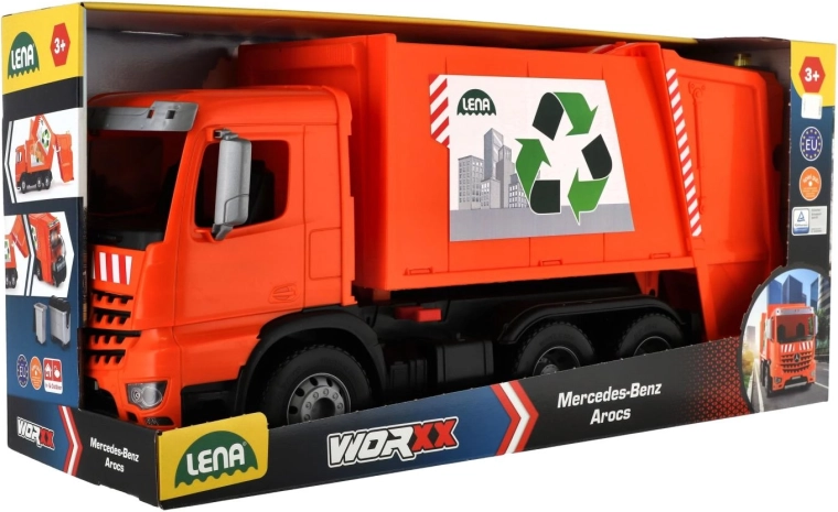 Smetarsko vozilo MERCEDES AROCS znamke LENA je natančno izdelano vozilo za male ljubitelje tehnike. Zaradi robustne izdelave iz kakovostne, odporne plastike in močnih kovinskih osi koles zlahka prenese vsakodnevno igro v notranjosti in na prostem. Funkcionalni zadnji del z varovalnim zatičem omogoča varno nakladanje in prevrnitev odpadkov.