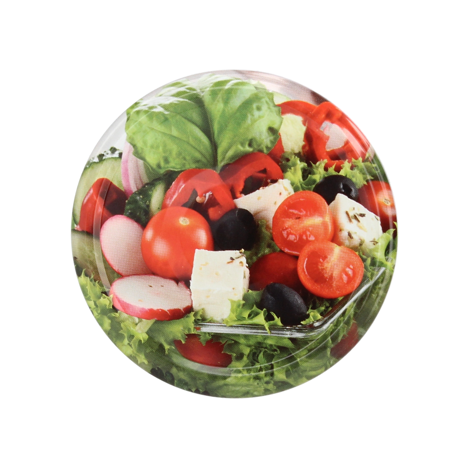 Konstrukcija iz pocinkanega jekla je odporna proti koroziji in pripravljena na visoke temperature med sterilizacijo in pasterizacijo. Silikonsko tesnilo zagotavlja zanesljivo prileganje na vrat kozarca ter tako zmanjšuje tveganje netesnosti. Mešanica motivov zelenjave doda vlaganinam privlačen videz in pomaga hitro razlikovati vsebino kozarcev.
