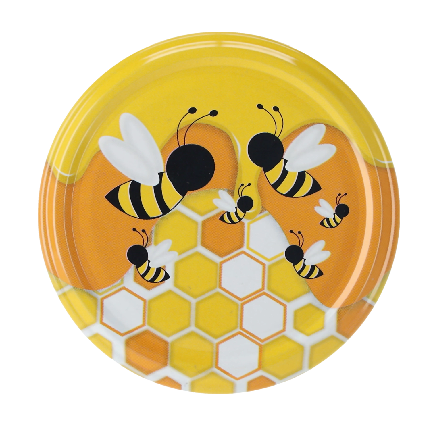 Praktični pokrovčki fi82 z veselým motivom čebelice so idealni za kozarce za vlaganje, zlasti za med in druge domače konzerve. Zahvaljujoč zanesljivemu navojу 6z zagotavljajo tesno zapiranje in privlačen videz, ki spodbuja prodajo ter pritegne pozornost na prvi pogled.