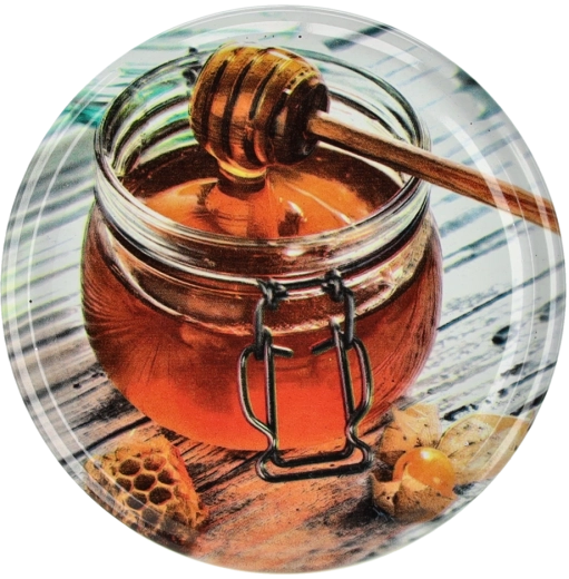 Dekor z motivom satja in čebel jasno nakazuje medeno vsebino in kozarcem hkrati dodaja estetski pridih – idealno za domače čebelarje in darilna pakiranja. Pokrovčki so primerni za pasterizacijo in druge metode konzerviranja, zato so primerni ne le za med, temveč tudi za džeme, kompote in vloženine.