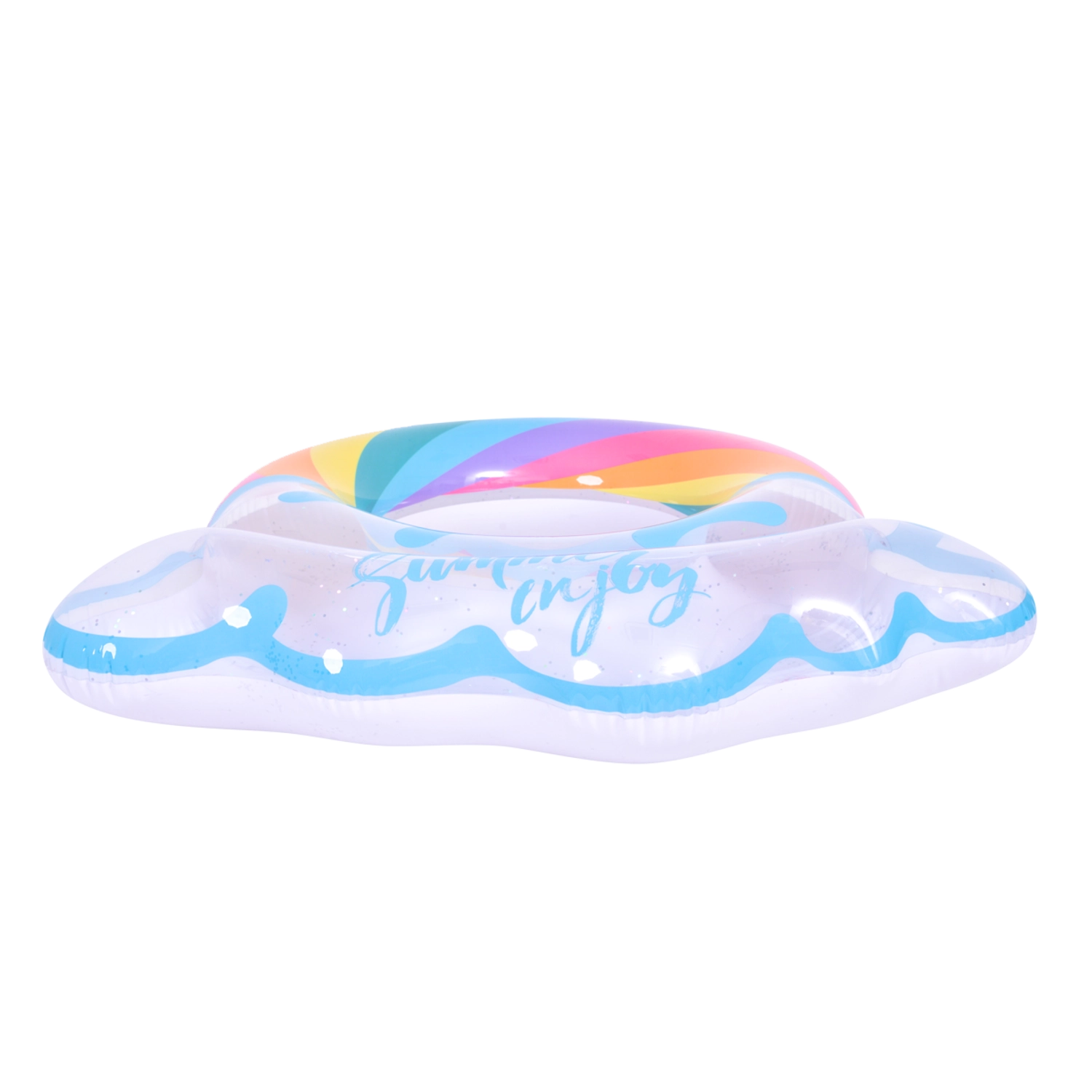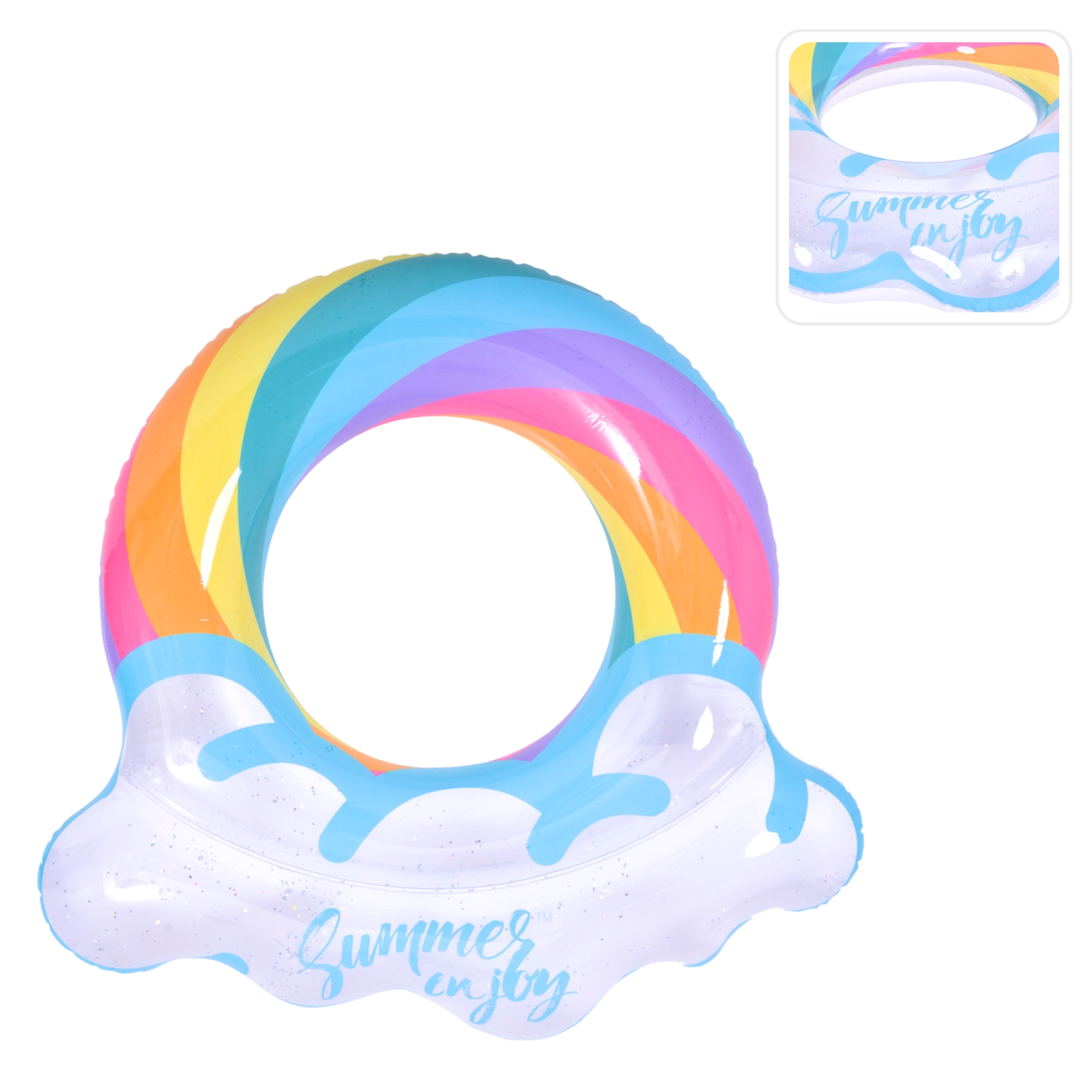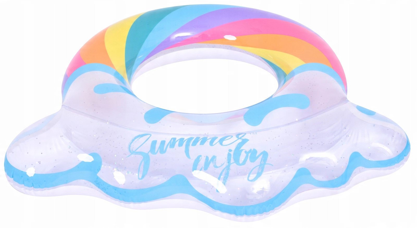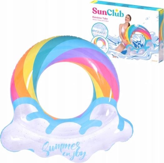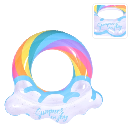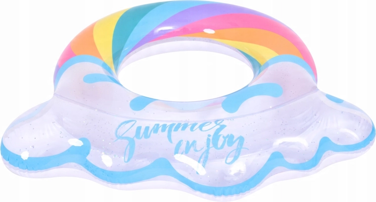 Napihljiv krog z motivom mavrice in oblačkastimi robovi je popoln spremljevalec za poletno zabavo. Prozorno telo z barvnimi črtami in bleščečimi delci zagotavlja odlično vidnost na vodi in hkrati izstopa na vsaki fotografiji. Zahvaljujoč čvrsti vinilni konstrukciji je krog odporen proti drgnjenju in običajni obrabi.