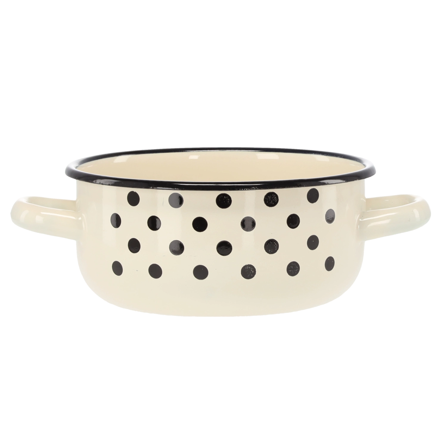 Praktičen emajliran lonec s prostornino 1,5 l in premerom 16 cm v elegantni beli barvi z dekorativnimi pikami. Zahvaljujoč dvema ročajema je z njim udobno rokovati, idealen je za vsakodnevno kuhanje, pogrevanje in serviranje. Vzdržljiv emajl, stilna zasnova in preprosto vzdrževanje za veselje do kuhanja vsak dan.