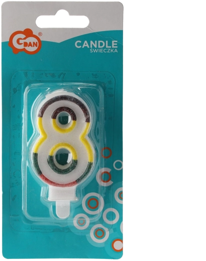 Poživite rojstnodnevno torto s stilsko svečko v obliki številke 8. Bel osnovni ton z nežnim bleščečim robom ustvari eleganten učinek, ki izstopa na vsakem rojstnem dnevu ali obletnici. Svečka je zasnovana za preprosto in varno namestitev.