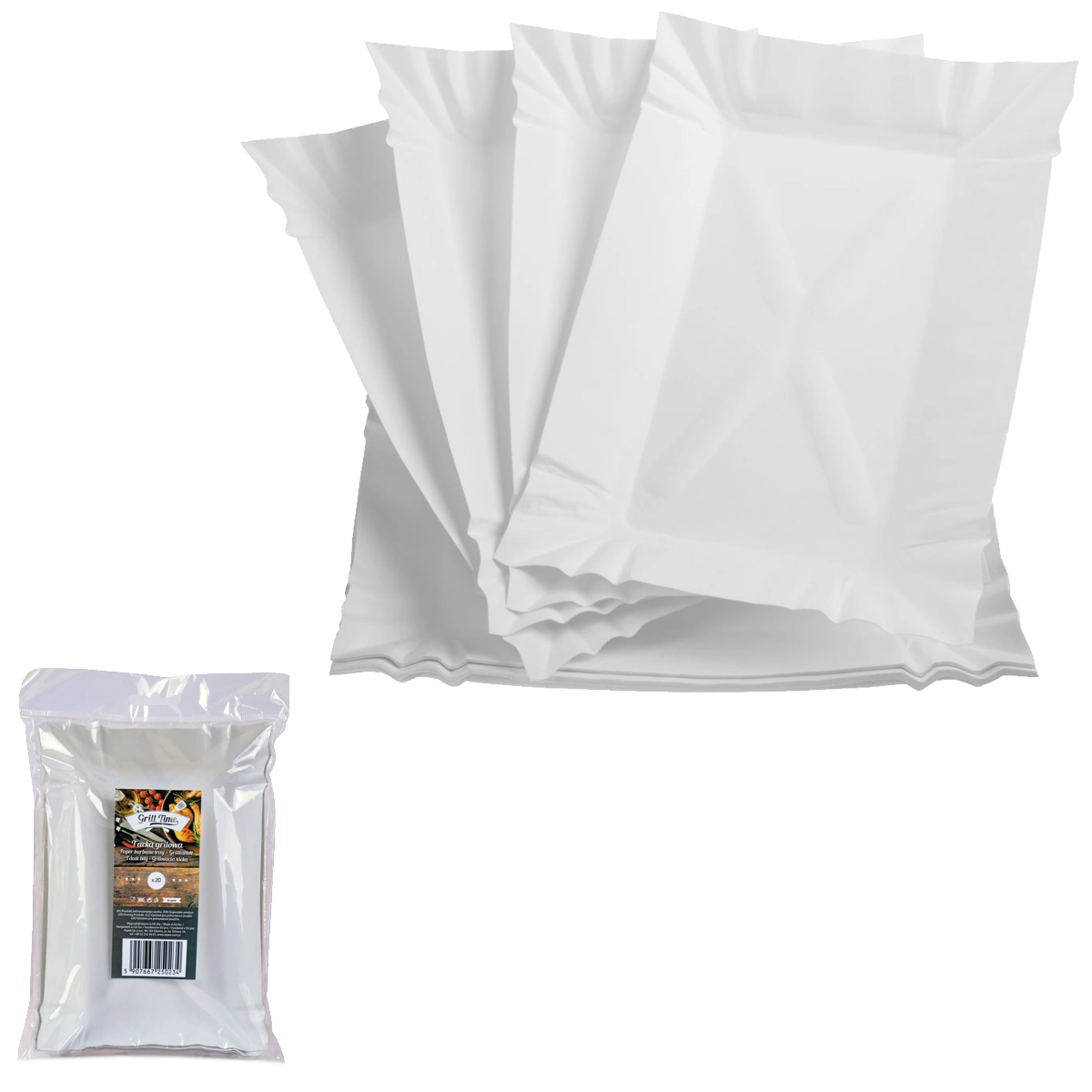Praktični papirnati pladnji z merami 20 × 13,5 cm so idealni za serviranje glavnih jedi, prigrizkov in sladic. Zahvaljujoč čvrsti zasnovi in kakovostnemu papirju zanesljivo ohranjajo obliko, medtem ko se elegantna bela izvedba poda k vsaki priložnosti. Enkratna uporaba prihrani čas in je okolju prijaznejša alternativa plastiki.