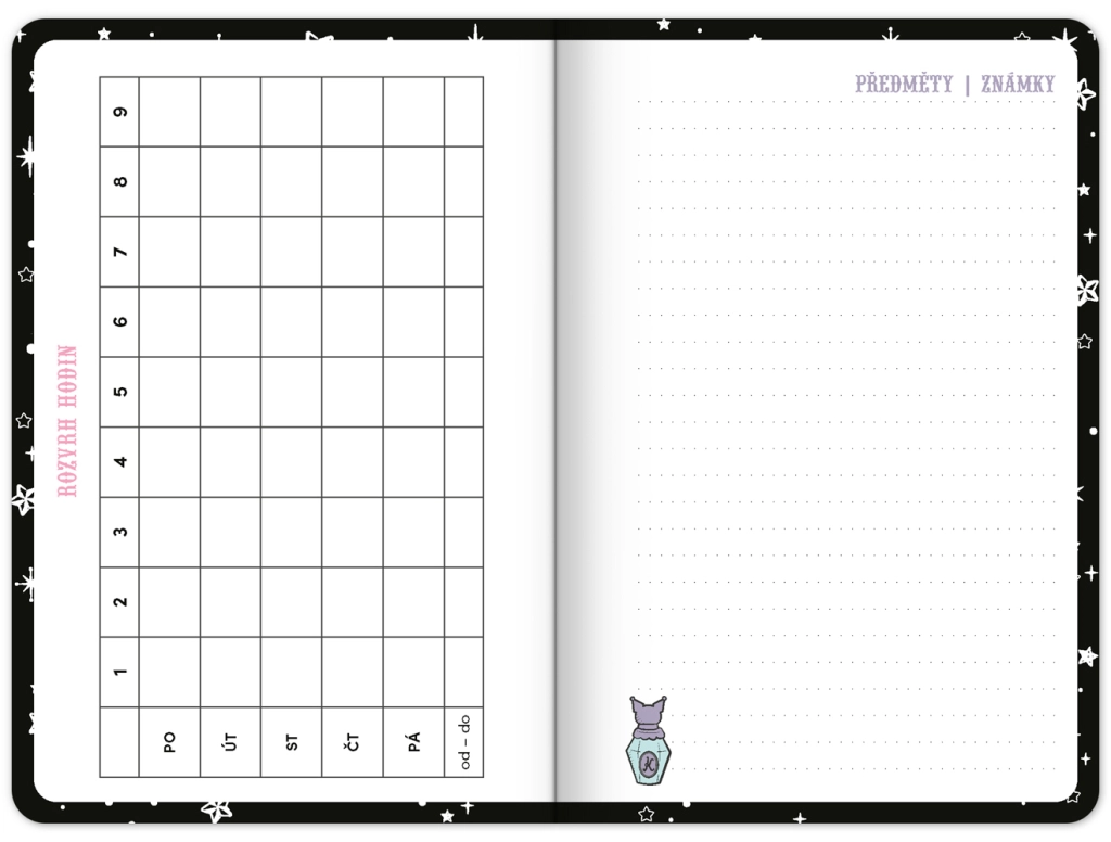 Slogovni študentski planer z motivom KUROMI za osnovnošolce in dijake/študente za obdobje september 2026 – december 2027. Ponuja praktične plonke iz matematike, fizike, kemije in angleščine, pregled urnikov in terminov počitnic. Kompaktna velikost 9,8 × 14,5 cm se prilega vsakemu nahrbtniku ali torbici.
