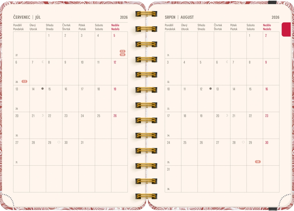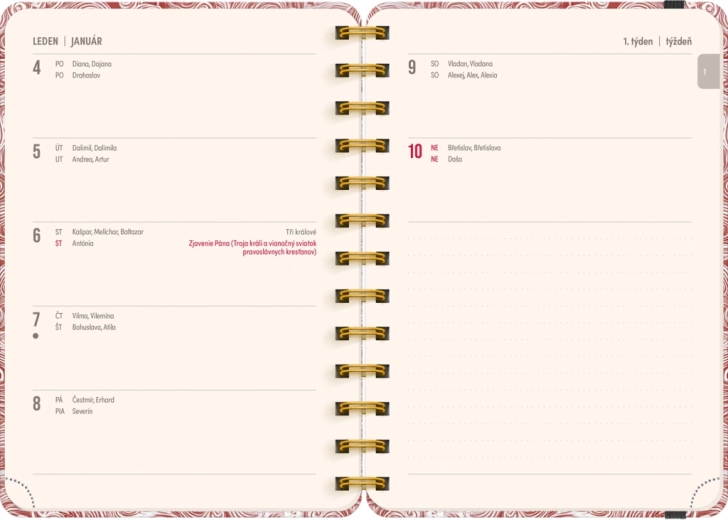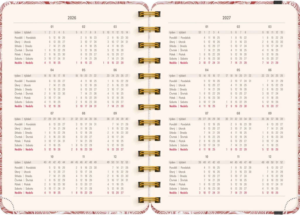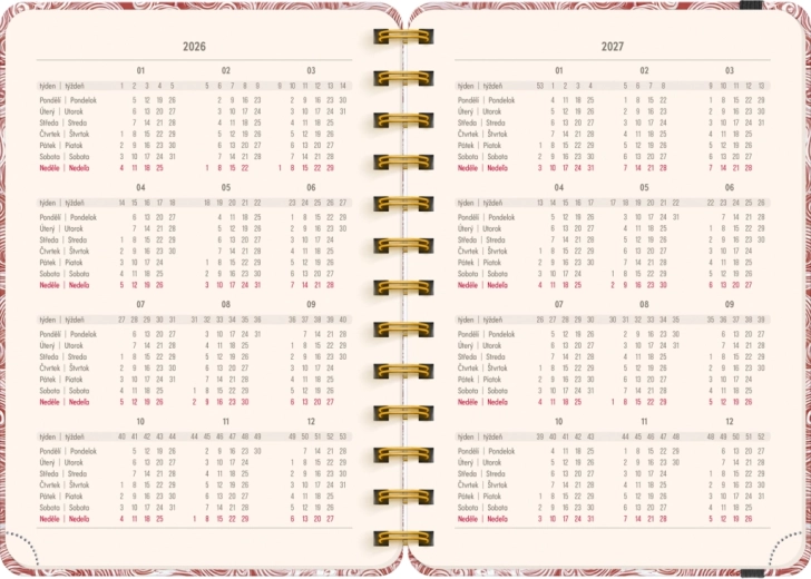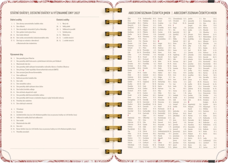 Planer vsebuje vse, kar potrebujete za učinkovito organizacijo časa: letna pregleda 2026 in 2027, seznam čeških in slovaških imen ter dovolj prostora za zapiske v vsakem tednu. Motiv Oblaki vašim načrtom doda lahkotnost in preglednost.