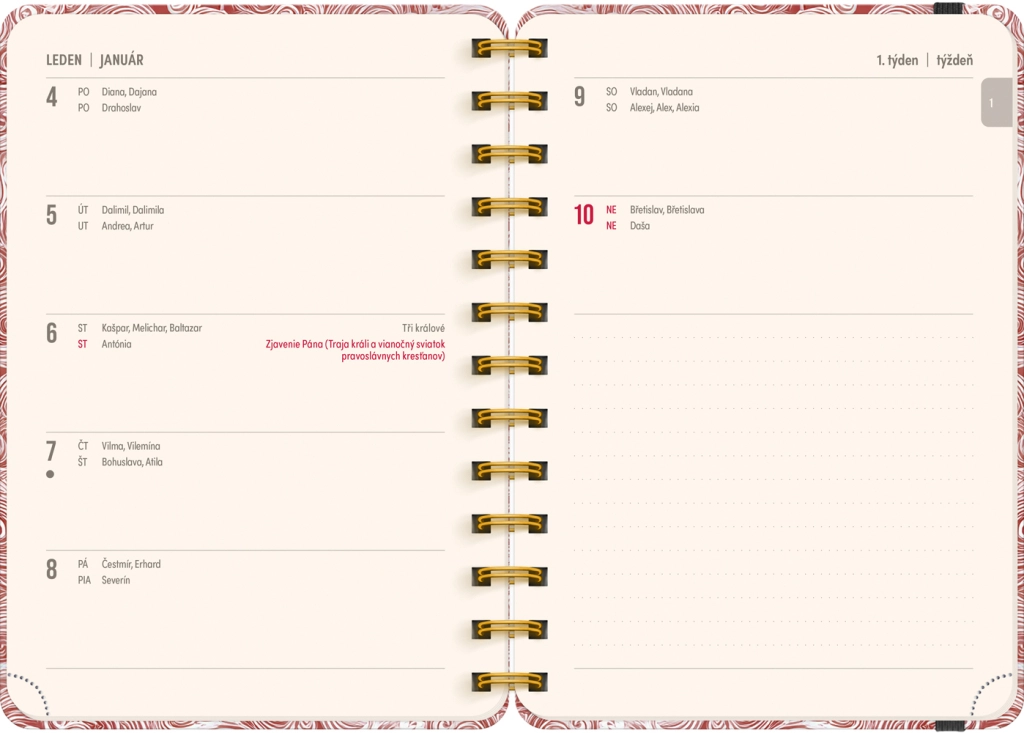 - Tedenski, vrstični, češko-slovenski, z imeni in prazniki