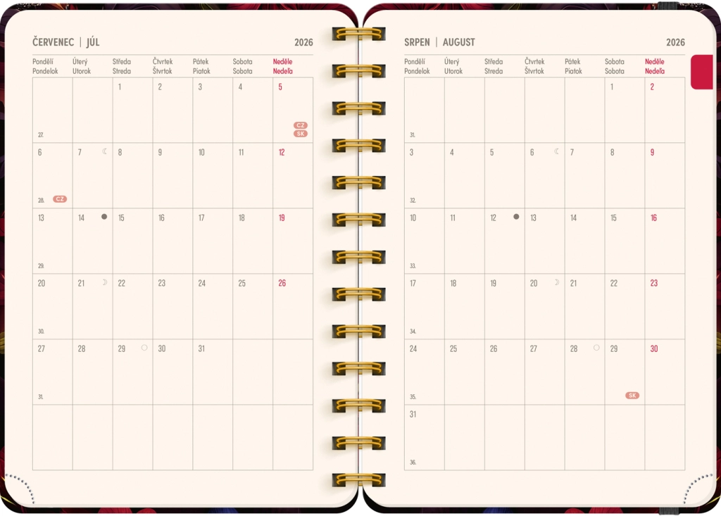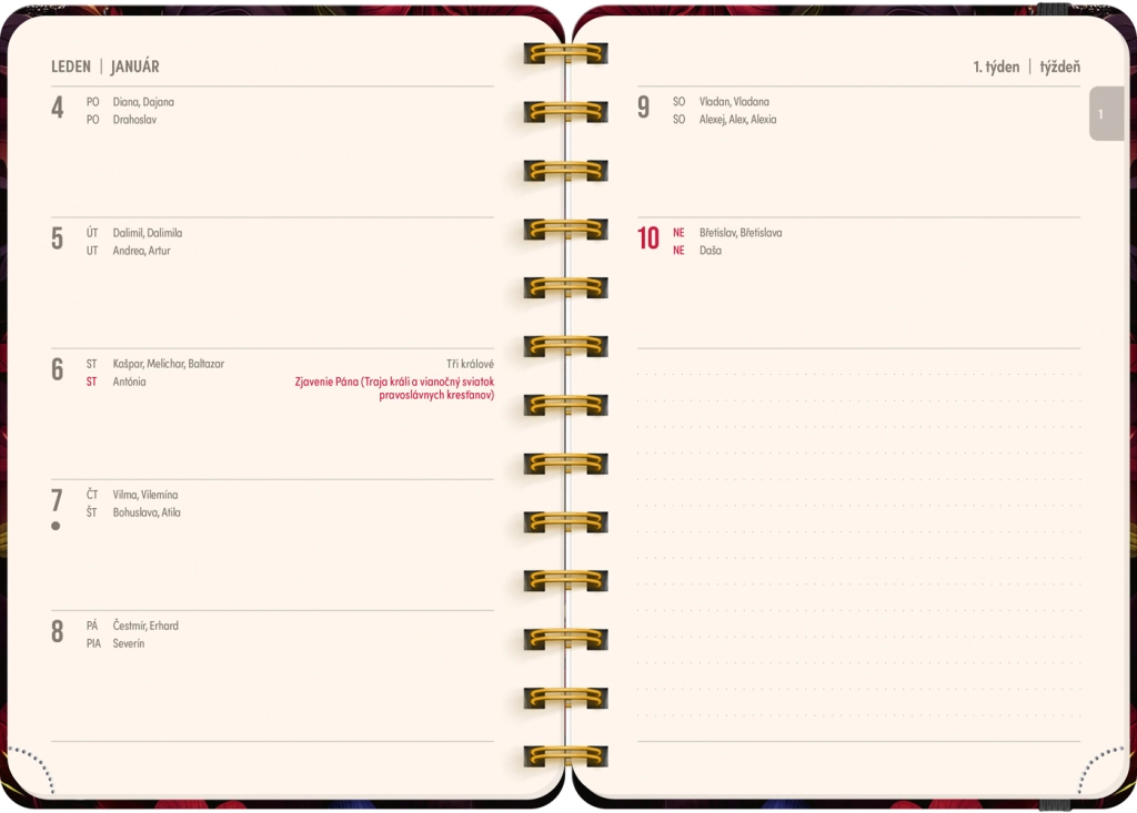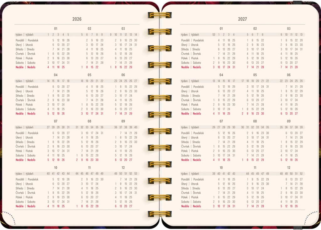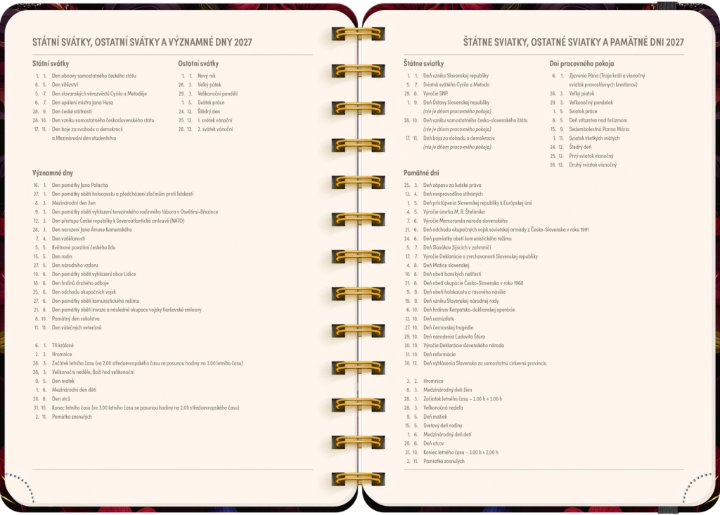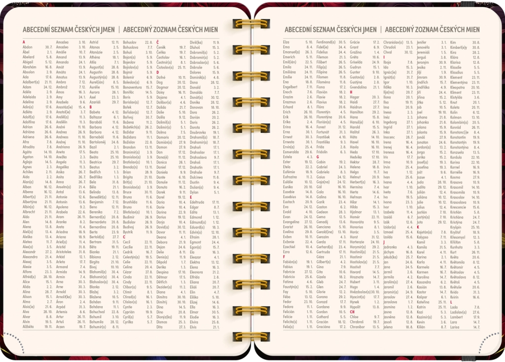 Priskrbite si stilskega partnerja za načrtovanje – 18‑mesečni planer Petito v dizajnu rdečih cvetov. Zahvaljujoč preglednemu češko‑slovaškemu tedenskemu koledarjenju z imeni in prazniki boste vedno imeli pregled nad pomembnimi datumi. Spiralna vezava omogoča udobno odpiranje in pisanje na ravni površini.