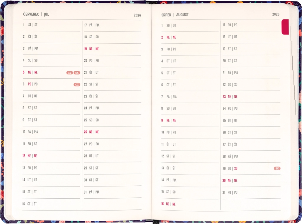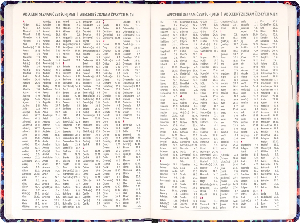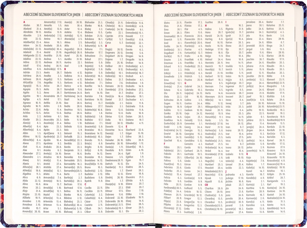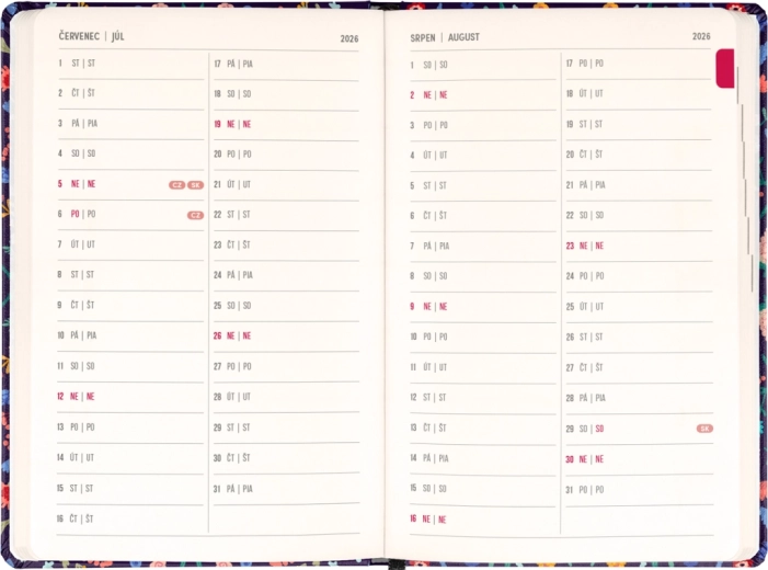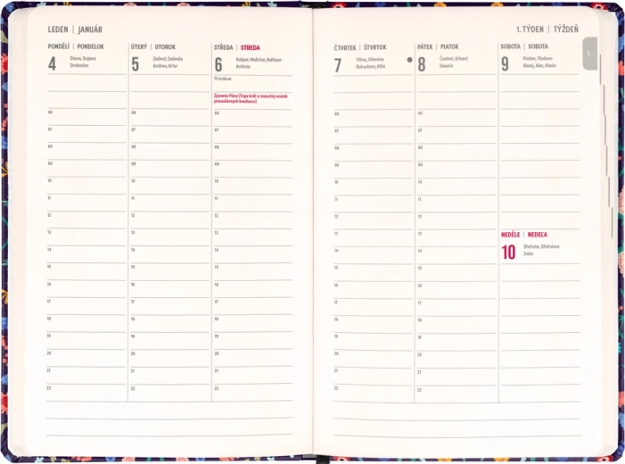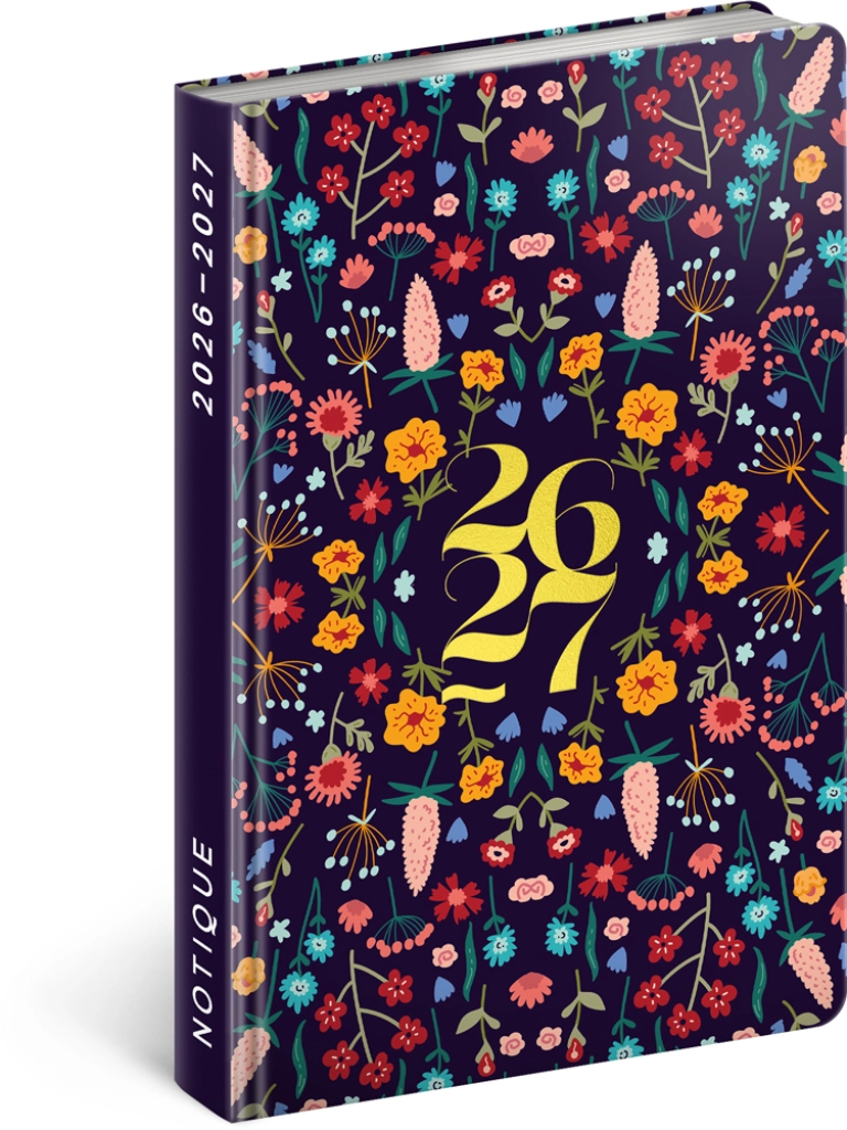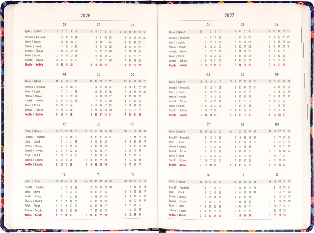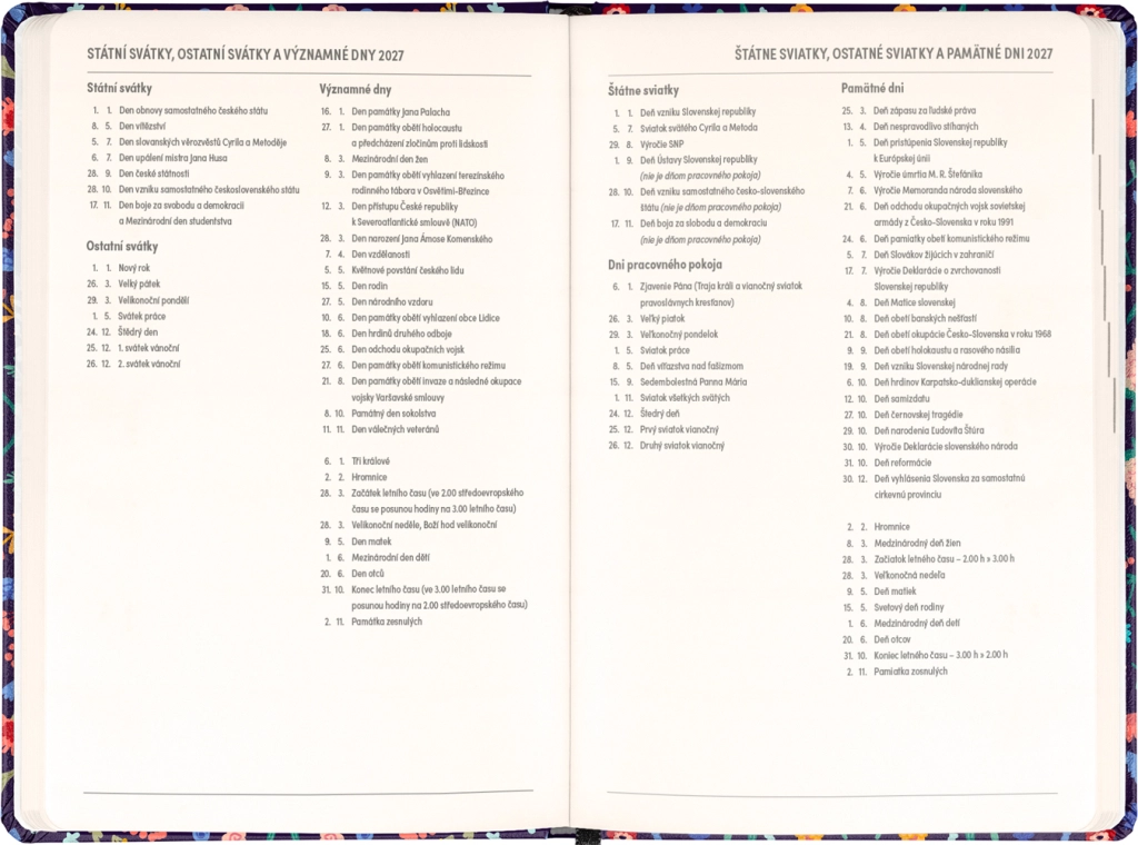 Stilski dnevnik Notique Petito Flora združuje praktično stolpčno razporeditev tednov z nežnim cvetličnim dizajnom. Zahvaljujoč pregledom za leti 2026 in 2027 ter seznamu čeških in slovaških imen boste imeli praznike in načrte vedno pri roki.