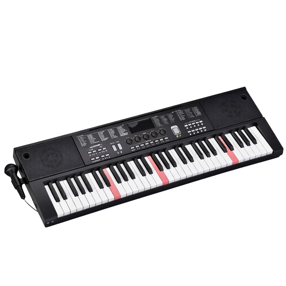 Univerzalna elektronska klaviatura s 61 tipkami, 200 zvoki, 200 spremljavami in 70 demo skladbami je idealna za začetnike in napredne. Ponuja osvetljene tipke Key Light za lažje učenje, pregleden LCD-zaslon, učne načine One Key, Follow, Guide ter napajanje prek USB. V paketu najdete tudi mikrofon in stojalo za note.