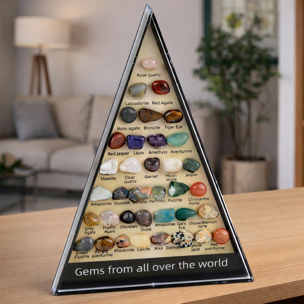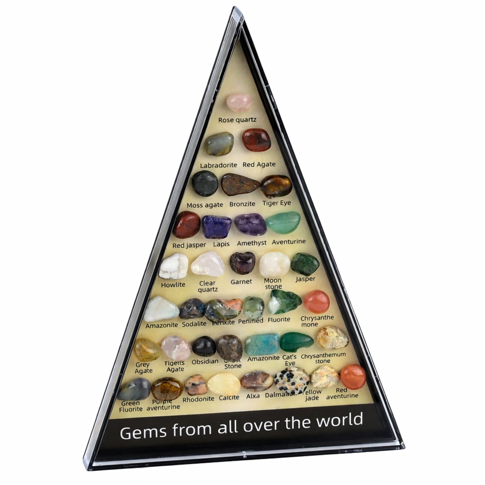 Odkrijte fascinantni svet geologije s to zbirko 36 naravnih mineralov v elegantni prozorni vitrini. Vsak kamen je skrbno izbran, označen z imenom in pregledno razporejen, zato je set idealen kot izobraževalni pripomoček, dekoracija in darilo za navdušence.