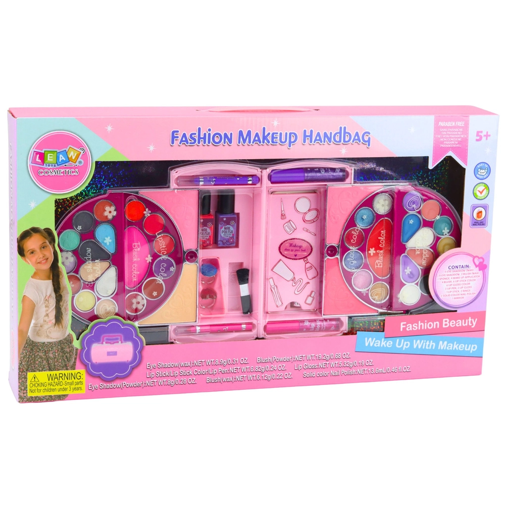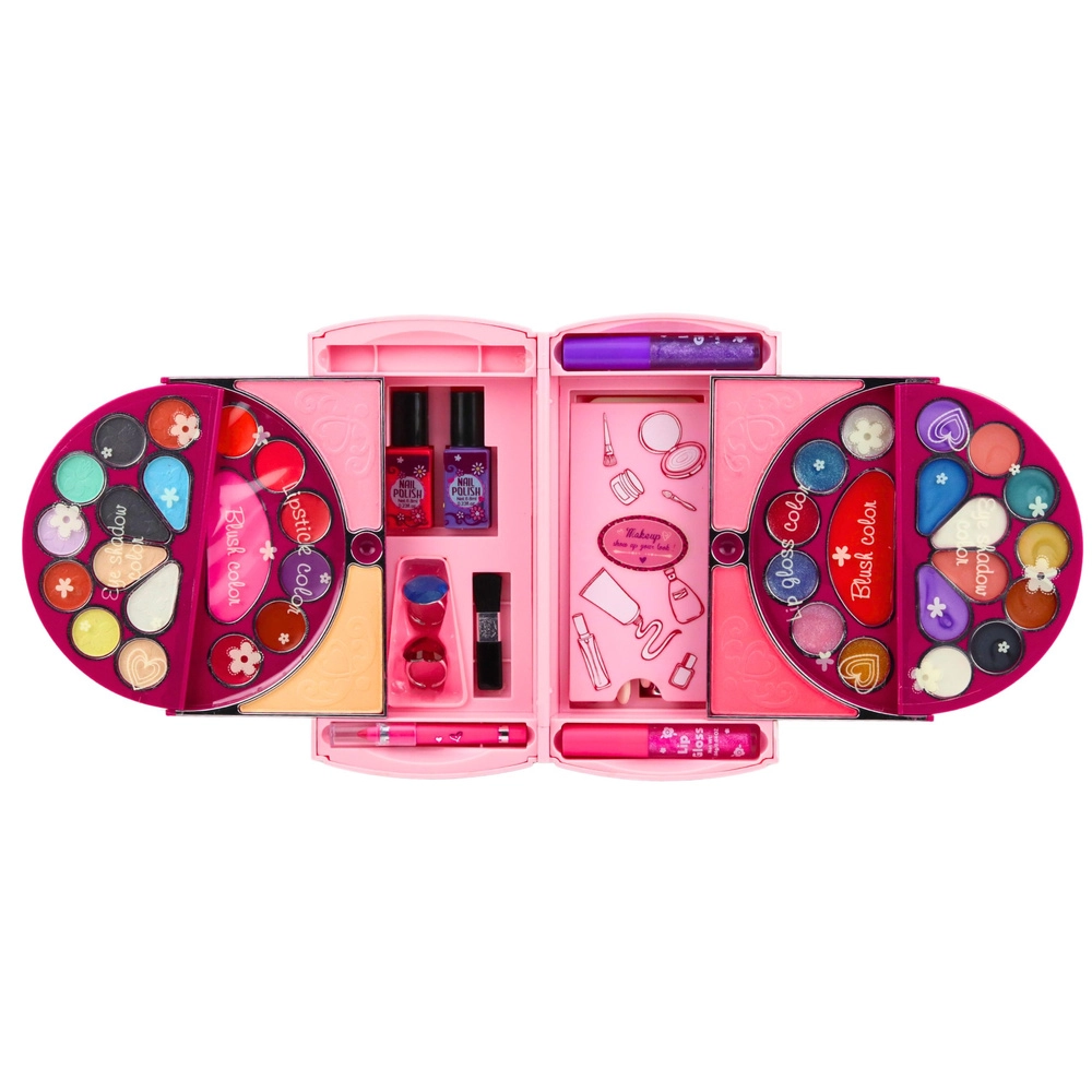 Velik zložljiv rožnat kovček za male ljubiteljice ličenja prinaša kompletno otroško make-up zbirko in dodatke za nohte. Po odprtju se spremeni v pregledno paletko z senčili, rdečili, sijaji in laki, dopolnjeno z varnim ogledalcem, aplikatorji in gobicami. Kozmetika je nežna do otroške kože, zlahka se spere z vodo in je odišavljena s sladko-sadnim vonjem – idealno za ustvarjalno igro in prve korake v svetu lepote.