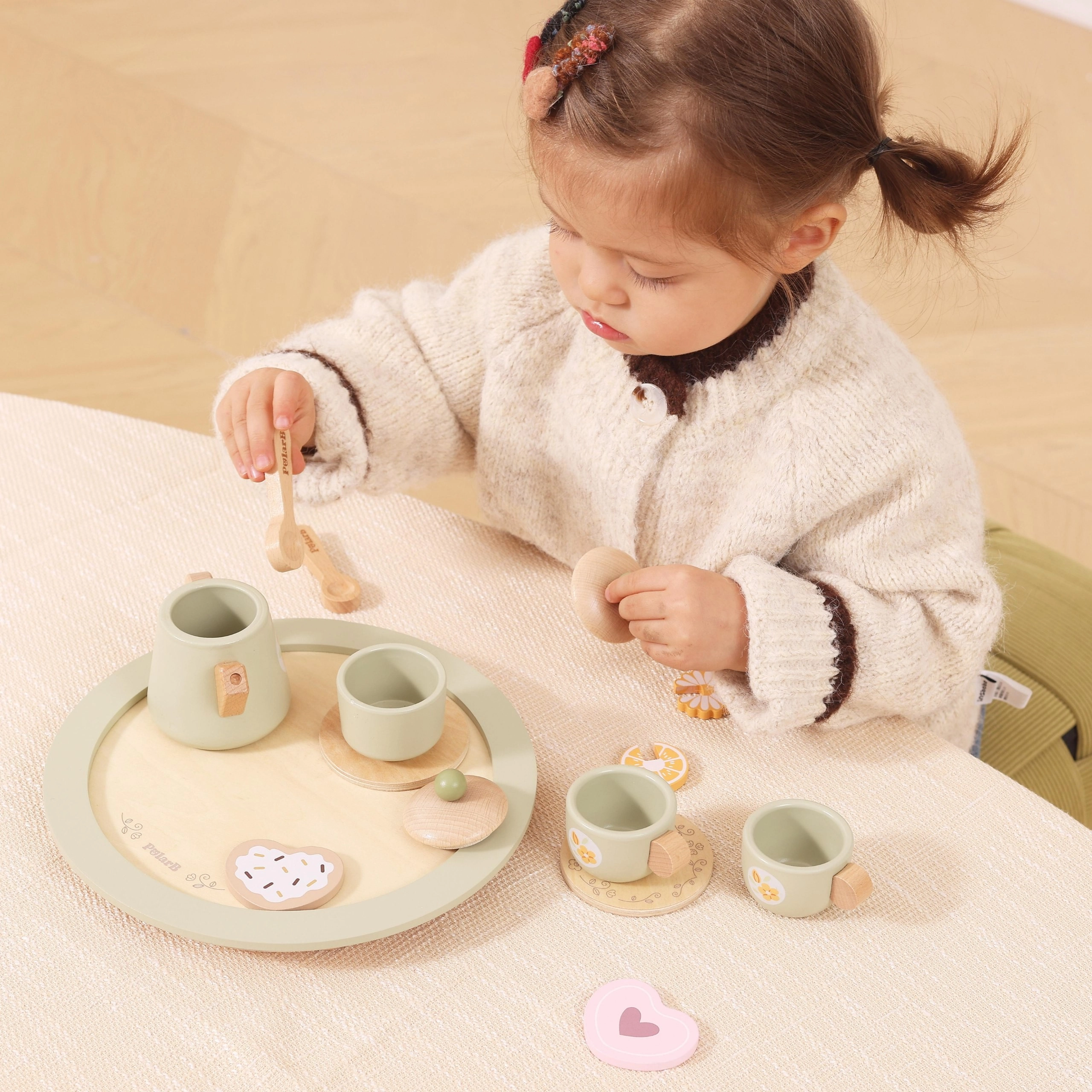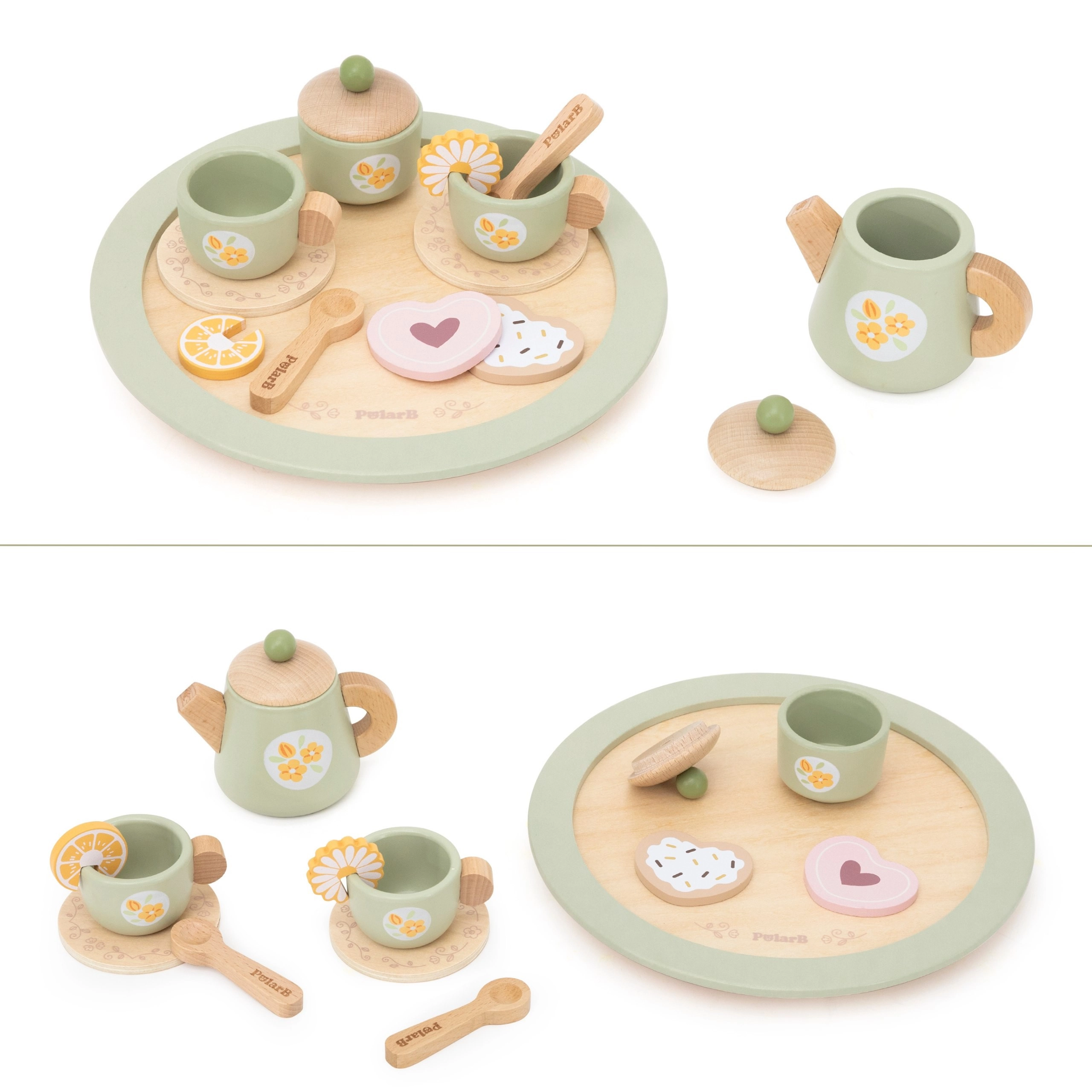 Popolna oprema, vključno s čajnikom, skodelicami, posodico za sladkor, žličkami, sladicami in pladnjem, otroke spodbuja k posnemovalni igri, deljenju in učenju lepega vedenja.