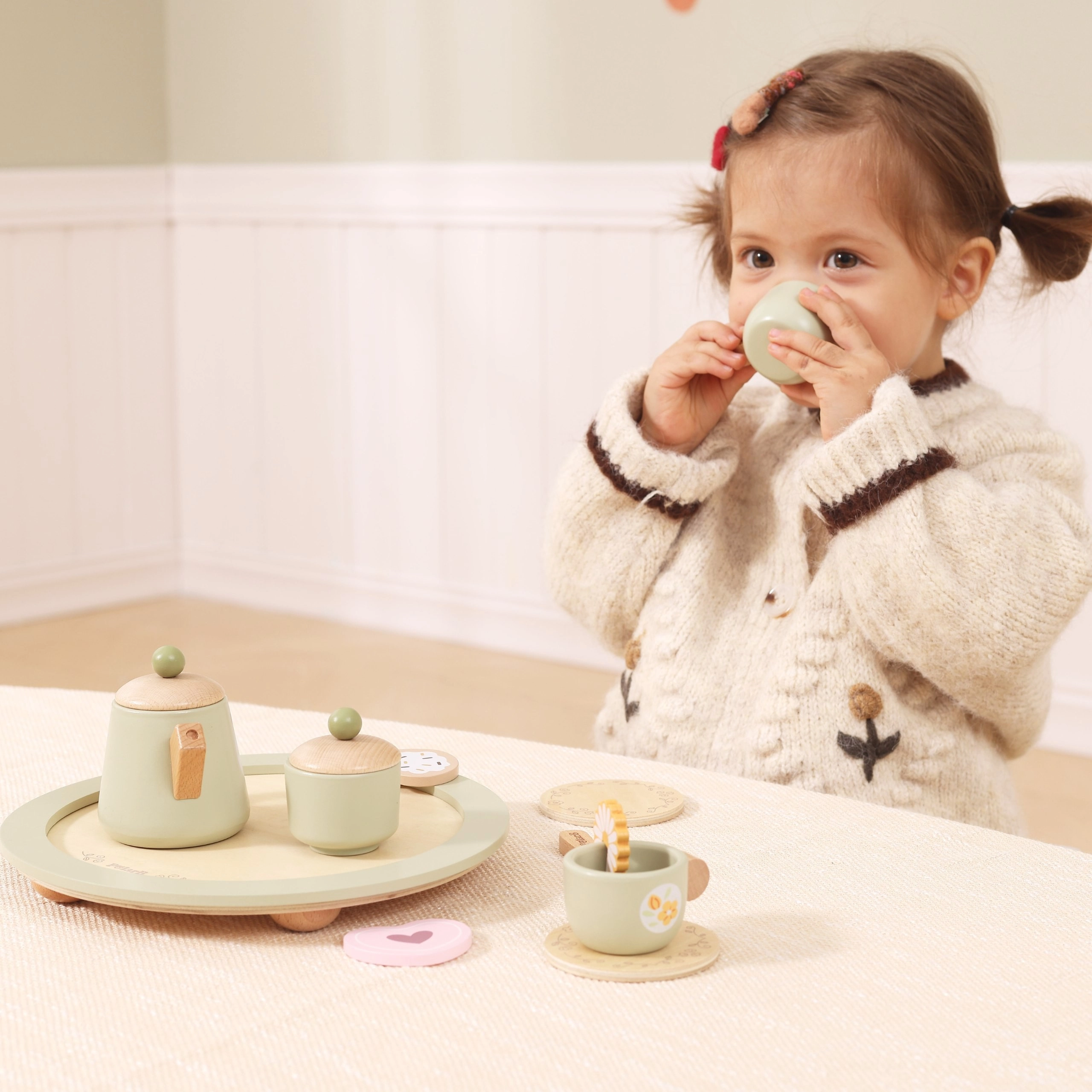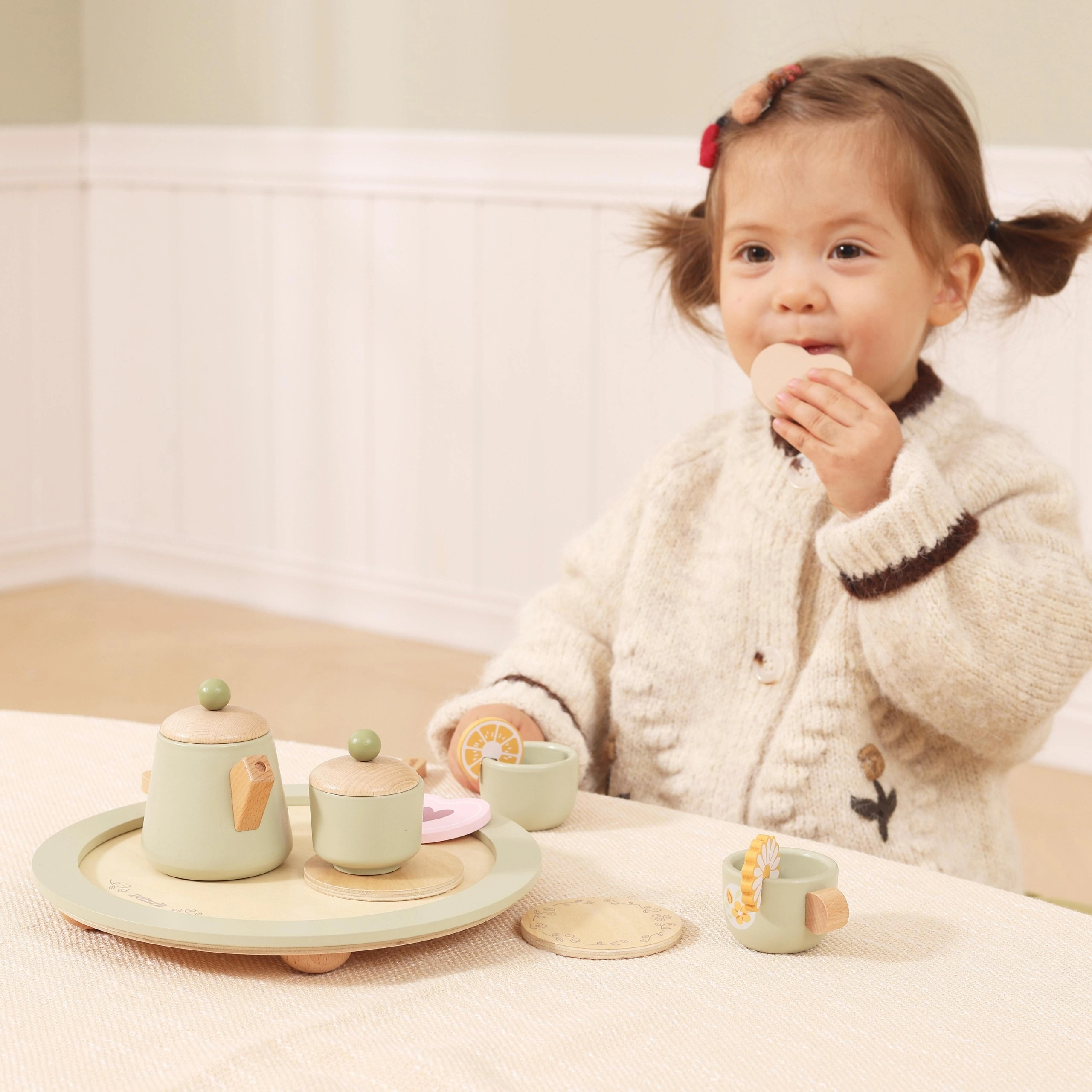Lesen čajni set Viga otrokom prinaša čar klasične igre vlog v sodobnem skandinavskem slogu. Nežna pastelna zelena, naravni les ter drobni cvetlični in limonini detajli ga naredijo za čudovit dodatek otroški sobi. Igra spodbuja razvoj fine motorike, sodelovanja in domišljije.
