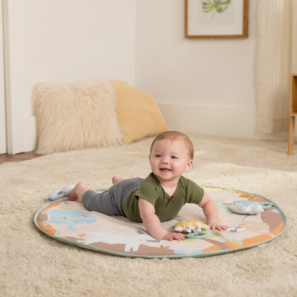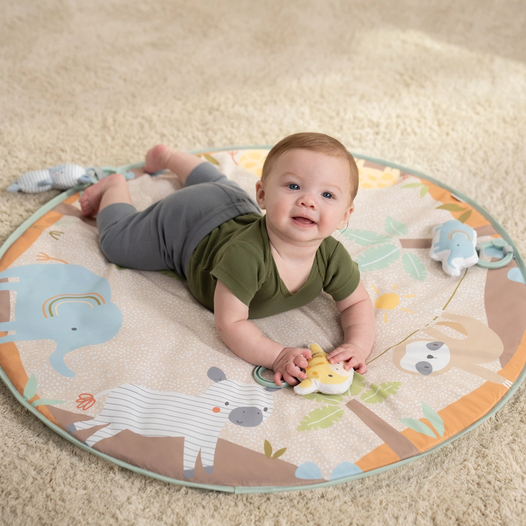 Teksturiran list – grizalo, mehka žirafa, nežna zebra, slonček s šelestenjem in varno tekstilno ogledalce spodbujajo vid, dotik in koordinacijo.