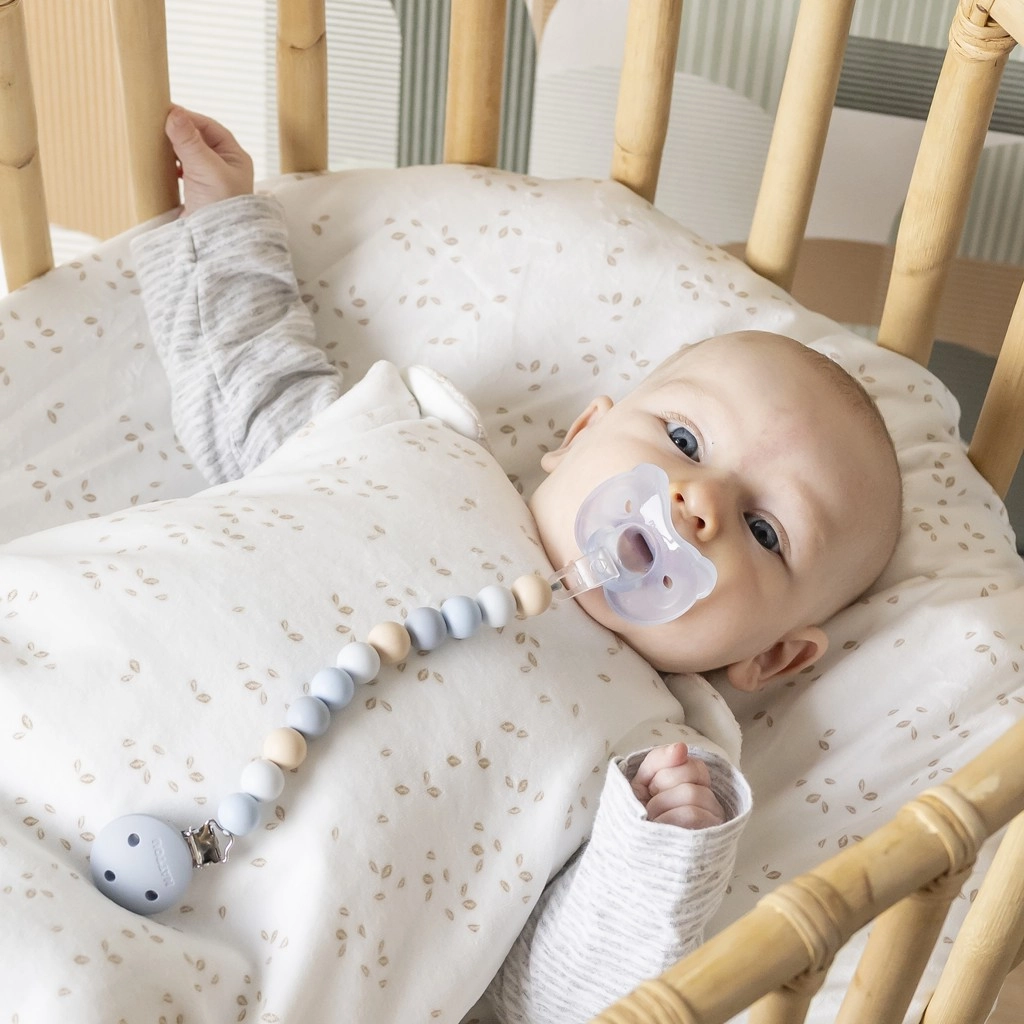 Praktična sponka za dudo Nattou v pastelno modrih in bež tonih je idealen vsakodnevni pripomoček. Preprečuje padec in izgubo dude, zato ostane higienska in lahko dostopna doma in na poti. Zaradi mehkih silikonskih kroglic brez BPA je nežna do otrok in prijetna na dotik.