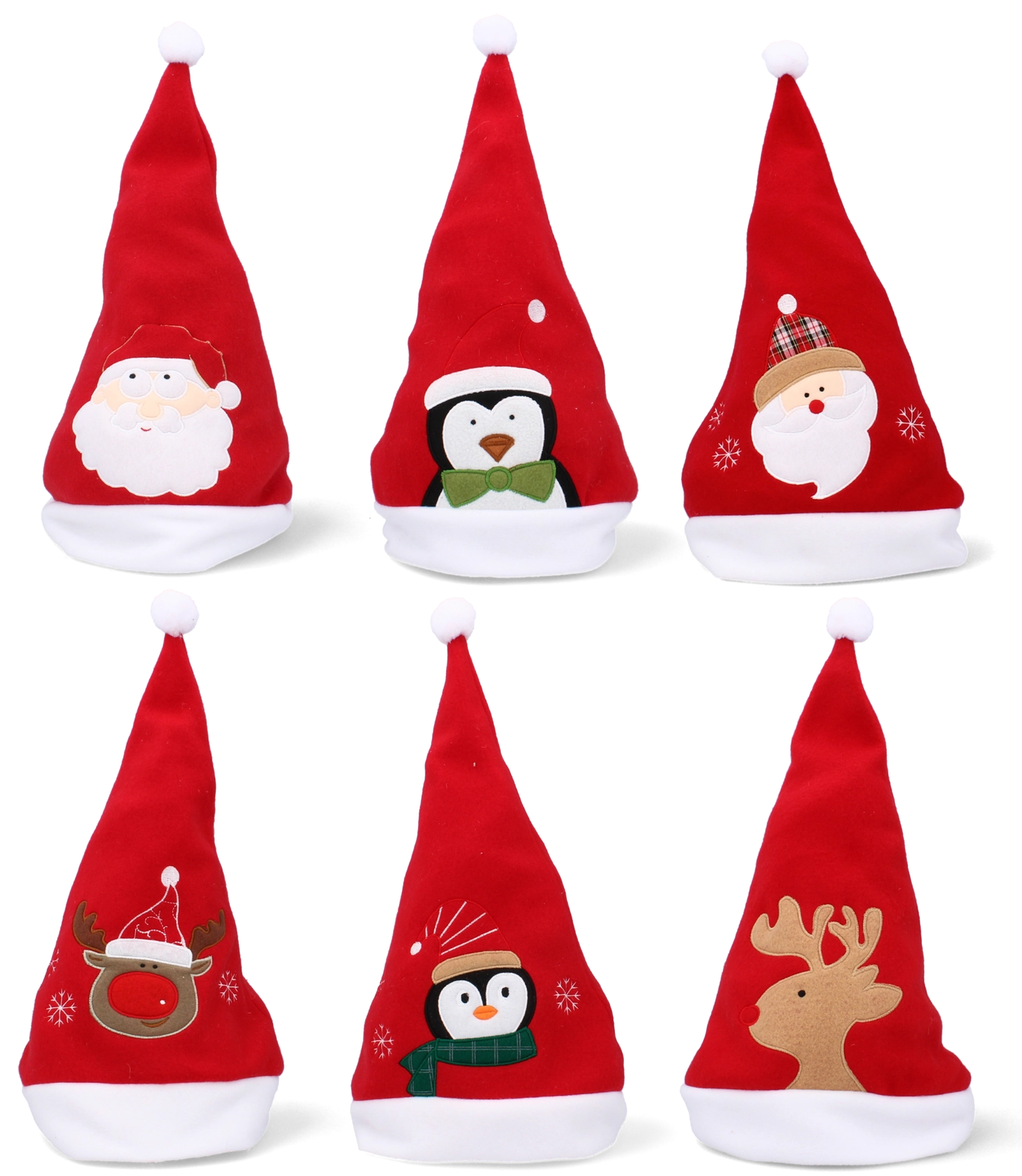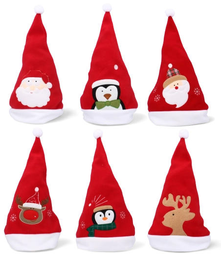 Vnesite v božič igriv pridih – rdeče kape Božiček z belim robom in cofom prinesejo takojšnje praznično razpoloženje. Vsako kapo krasi izrazita aplikacija (Božiček, pingvin, jelen, snežinke ipd.), s katero boste izstopali na vsaki zabavi in na družinskih fotografijah.