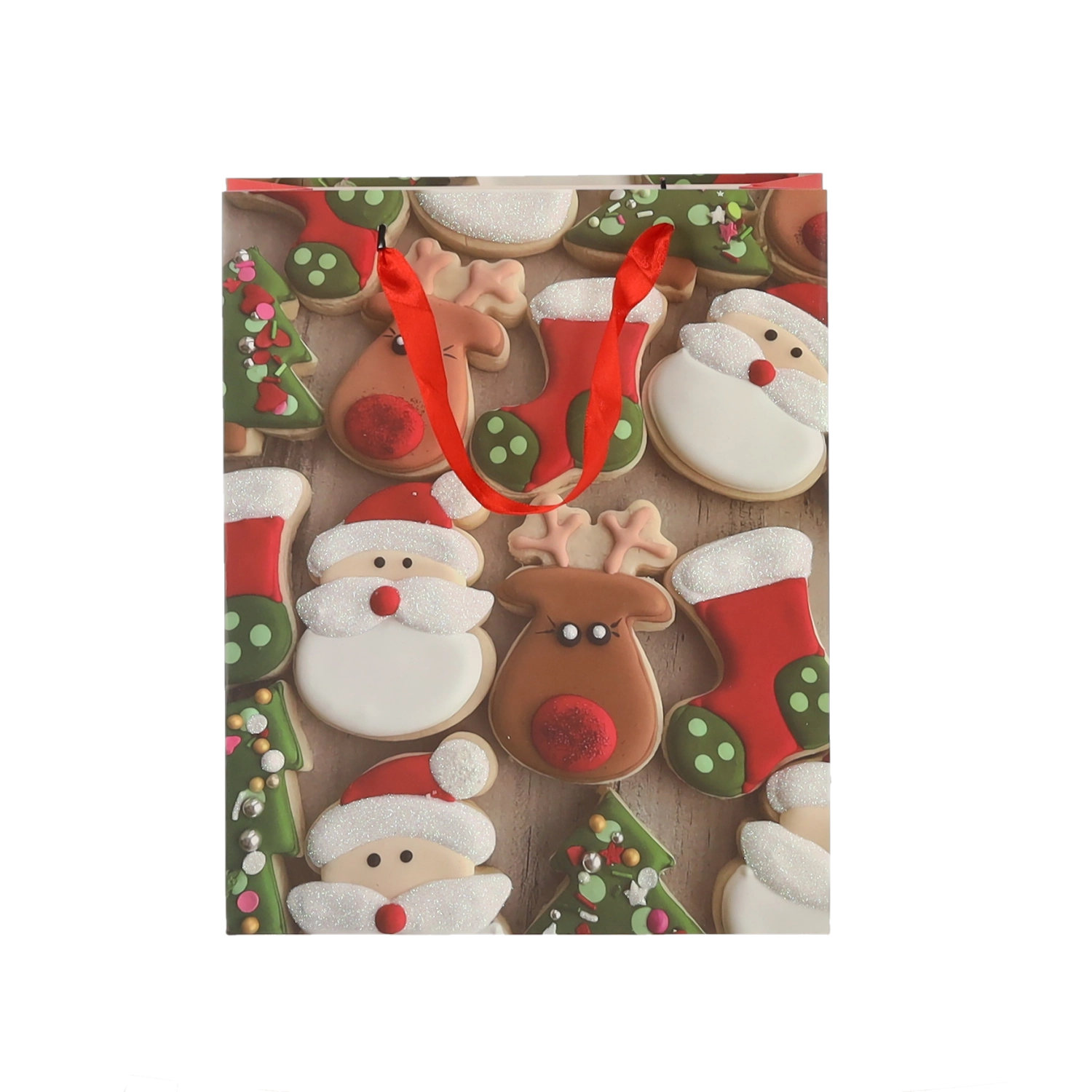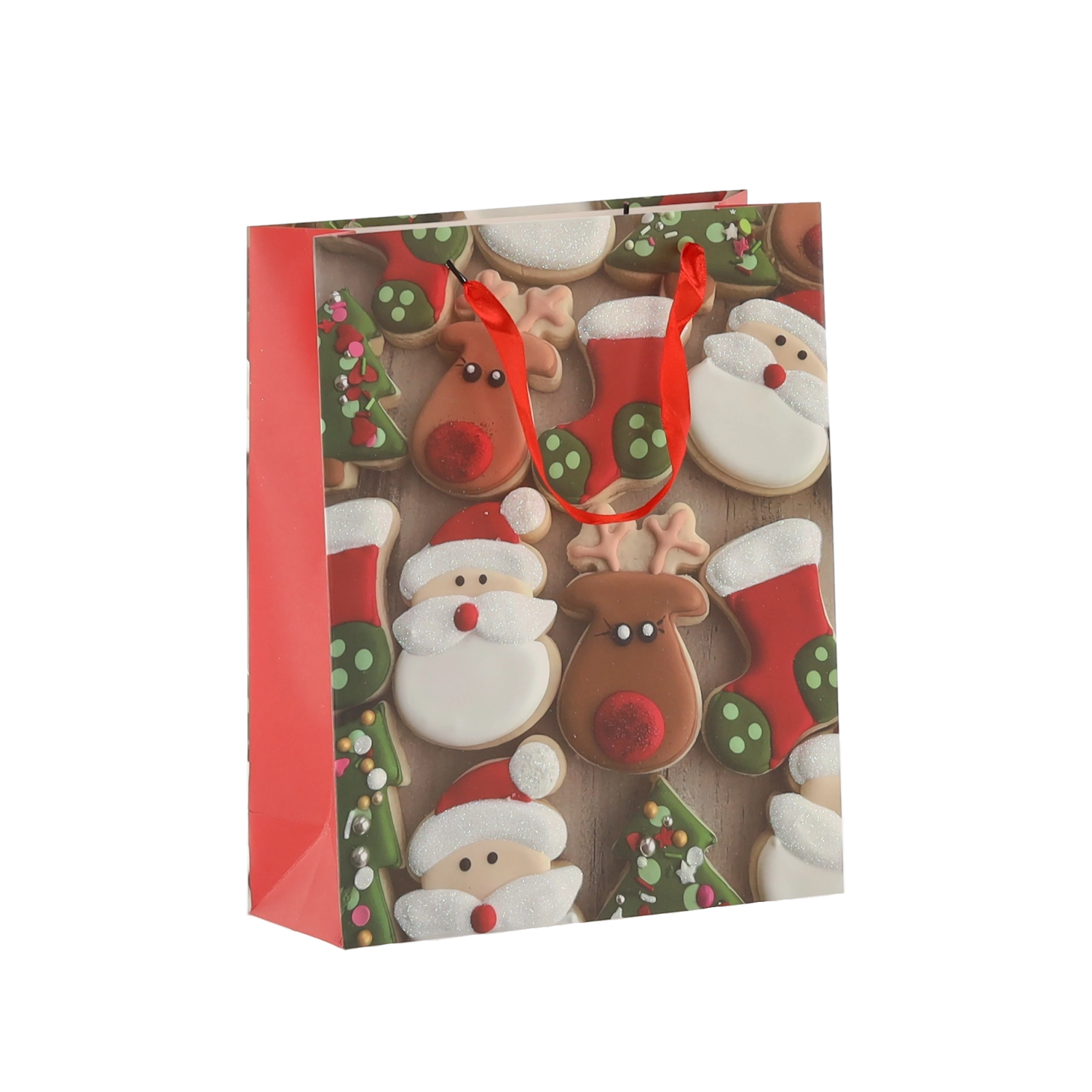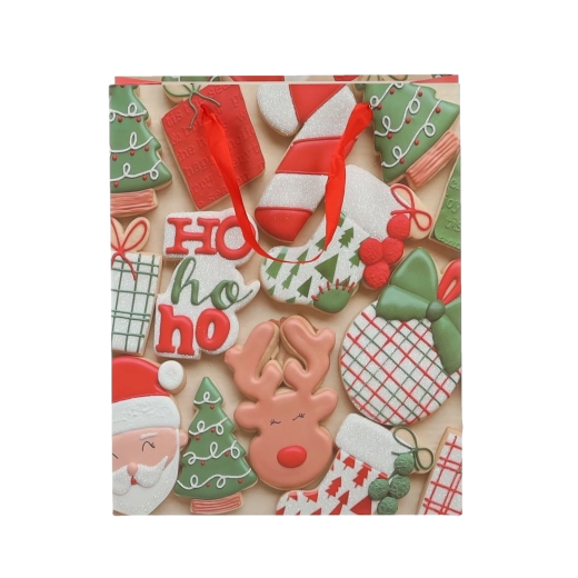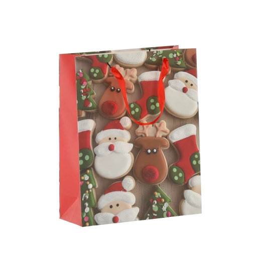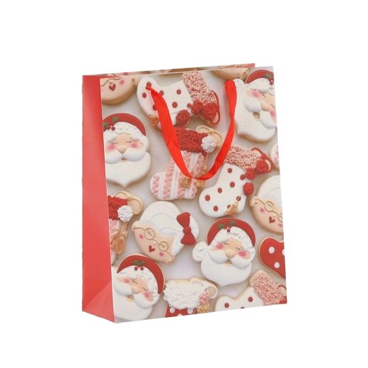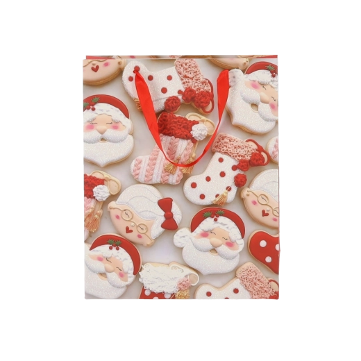 Praktičen komplet 12 božičnih darilnih vrečk velikosti 18 × 24 × 8 cm za hitro in stilsko pakiranje manjših daril. Vrečke iz kakovostnega papirja z gramatura 157 g/m² so čvrste in vzdržljive, imajo rdeče trakaste ročaje za udobno nošenje ter vesel potisk z motivi božičnih piškotov – Božiček, jelen, drevesca in rokavice. Idealne za kozmetiko, nakit ter manjše knjige.