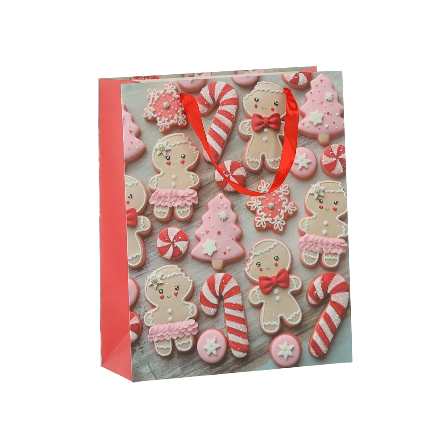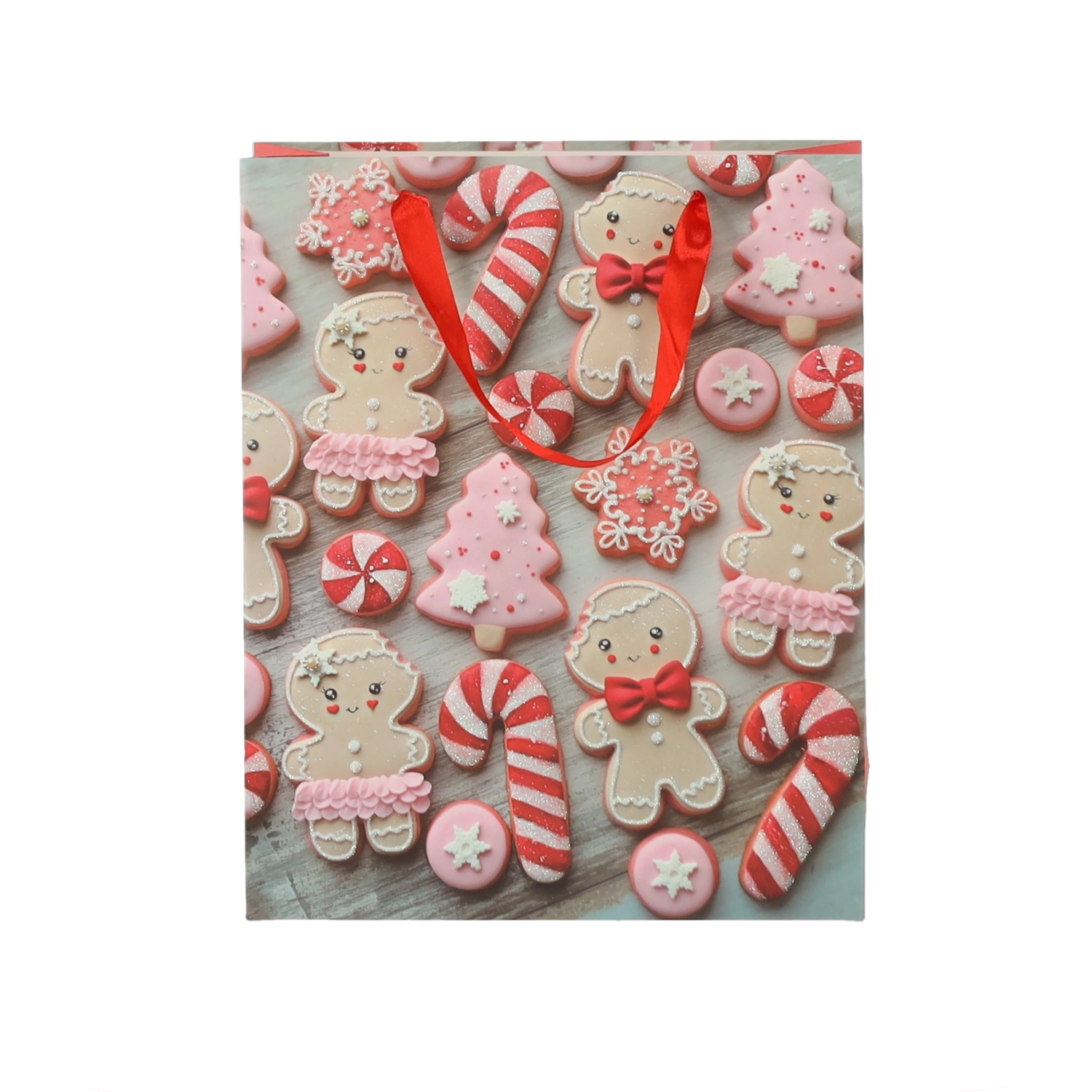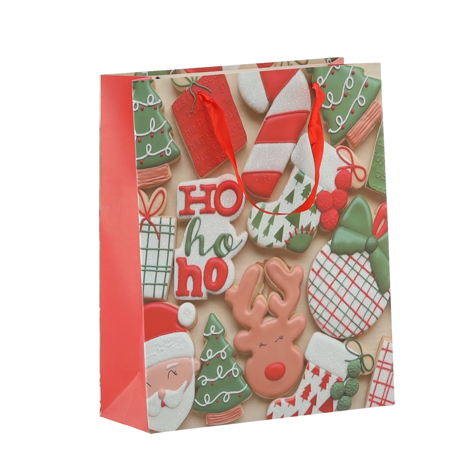 Praktičen komplet 12 božičnih darilnih vrečk velikosti 18 × 24 × 8 cm za hitro in stilsko pakiranje manjših daril. Vrečke iz kakovostnega papirja z gramatura 157 g/m² so čvrste in vzdržljive, imajo rdeče trakaste ročaje za udobno nošenje ter vesel potisk z motivi božičnih piškotov – Božiček, jelen, drevesca in rokavice. Idealne za kozmetiko, nakit ter manjše knjige.