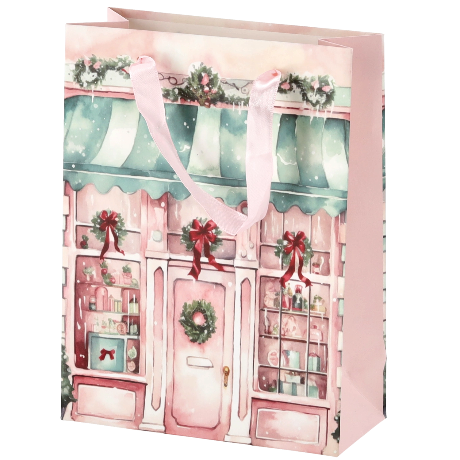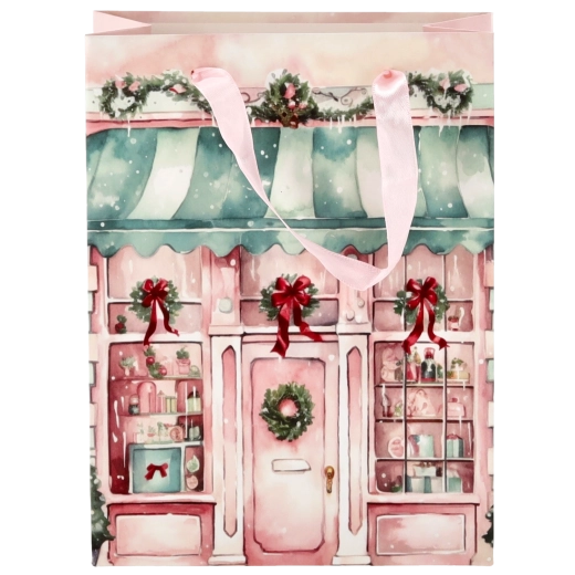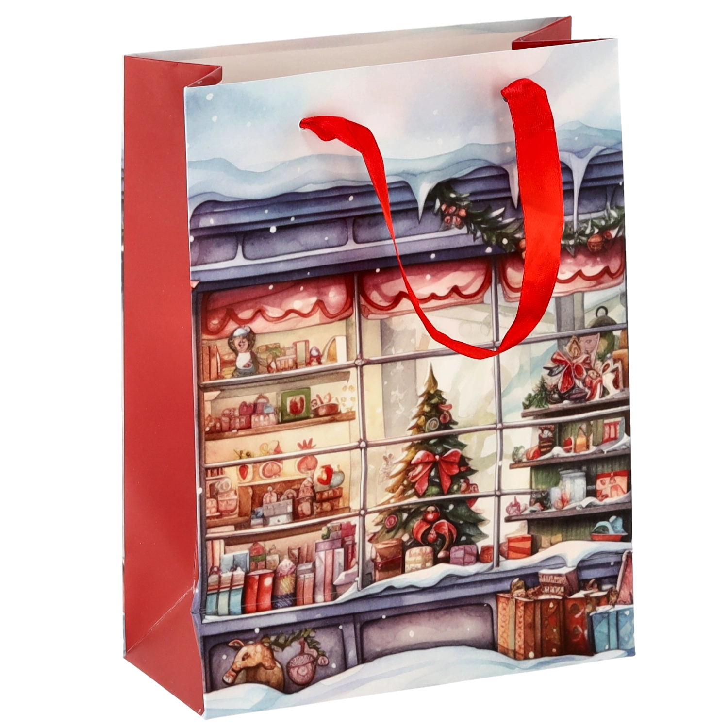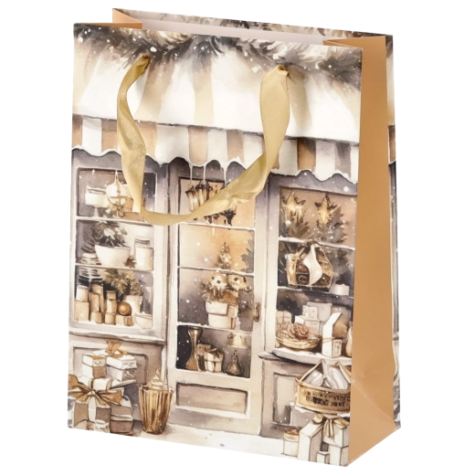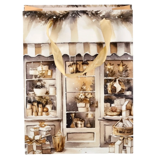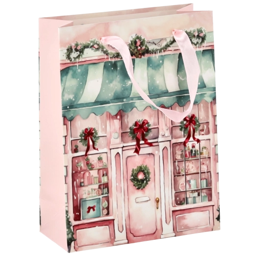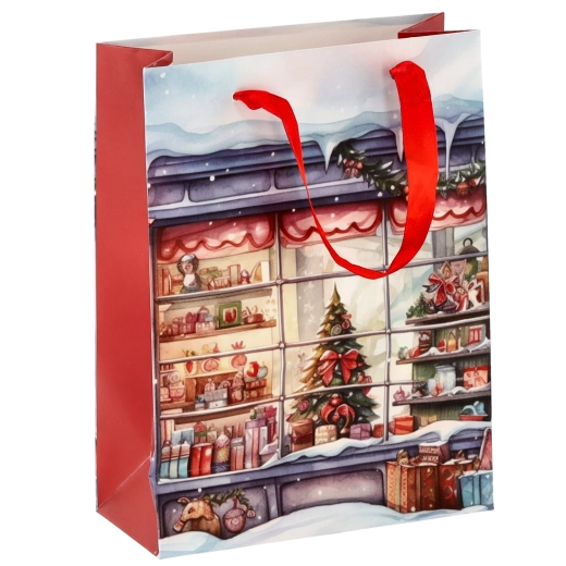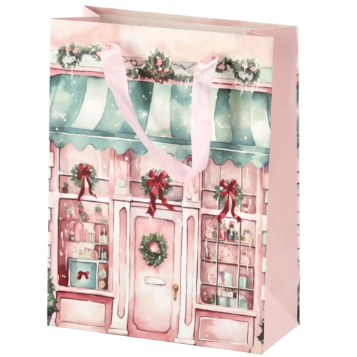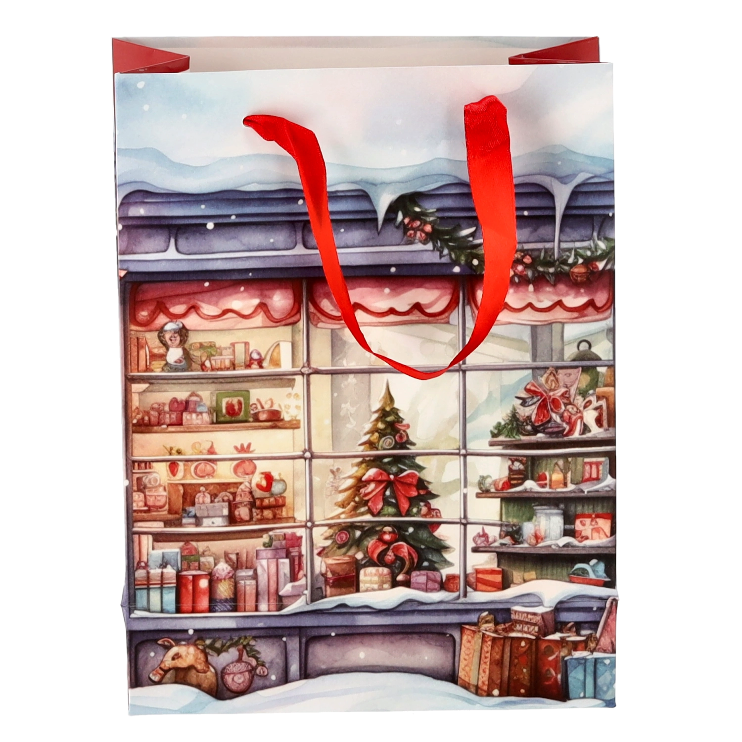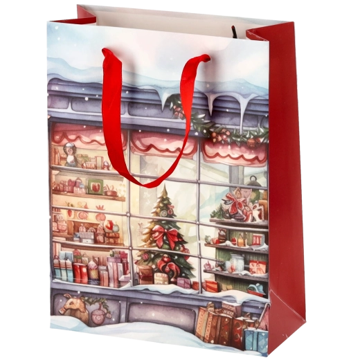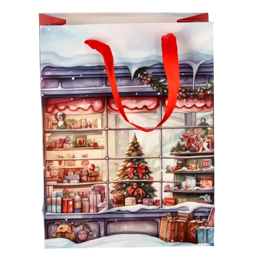 Spremenite zavijanje darila v pravo doživetje. Ta božična vrečka z ilustracijo hišice v tradicionalnem slogu je idealna izbira za praznično obdobje. Zaradi kompaktnih, a prostorno zasnovanih mer zlahka sprejme knjige, kozmetiko, sveče ali manjše komplete daril.