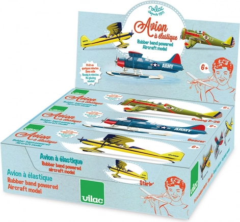 Lahka sestavljanka letala VILAC z navijalnim propelerjem na elastiko razveseli male in velike pilote. Izdelana iz trpežnega polistirena, ponuja preprosto montažo in 3 privlačne variante (npr. Boeing P‑26, Beaver). Idealno za otroke od 6 let, mere 37 × 45 × 5,5 cm.