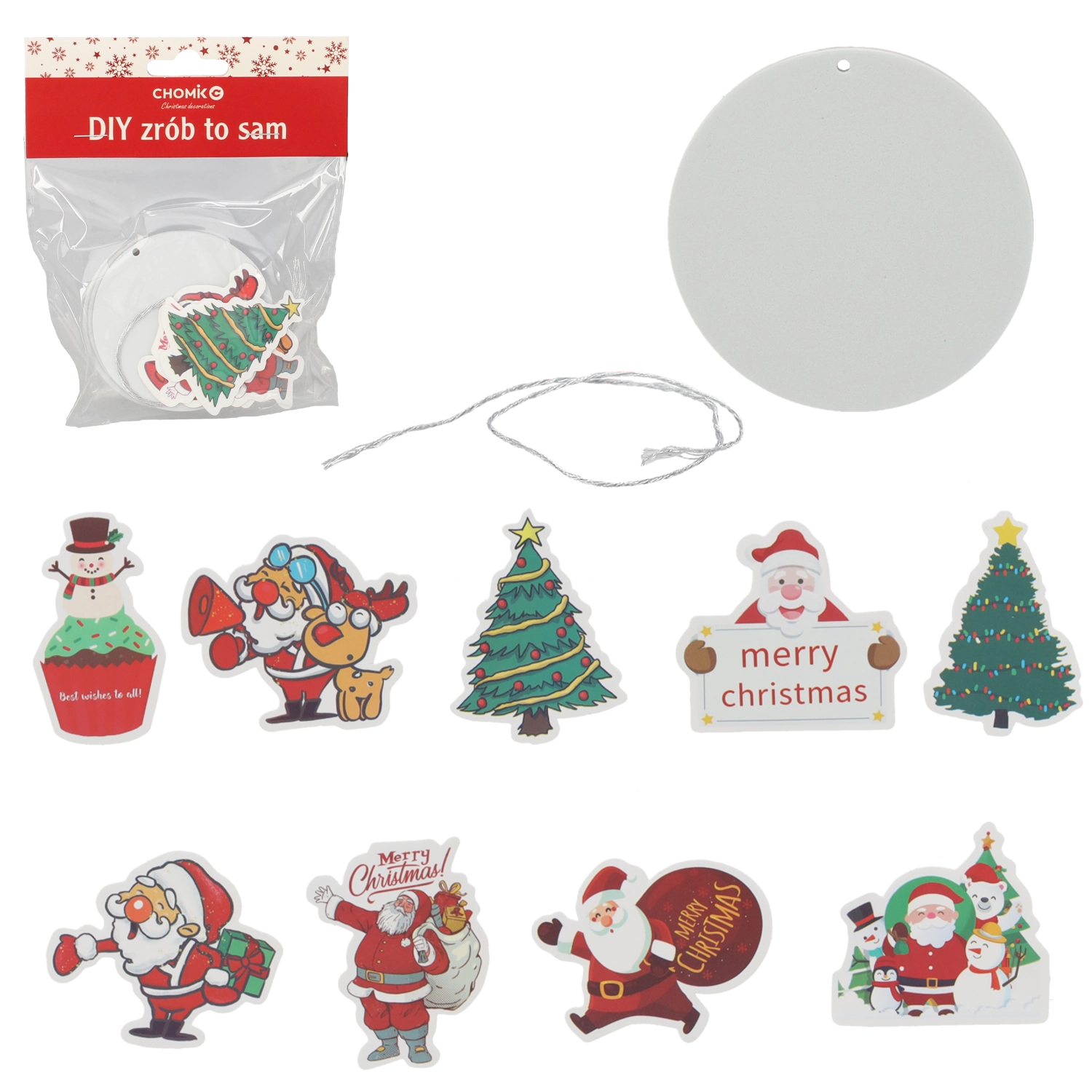 Ustvarite svoje božične dekoracije s kreativnim kompletom treh okraskov za obešanje. Vsak kos ima predvrtano luknjo in vrvico, zato je takoj pripravljen za na drevo ali za darila. Priložene so barvite nalepke z motivi, kot so Božiček, snežak in božično drevo, s katerimi okraske zlahka personalizirate. Odlično za ustvarjanje z otroki, razvoj ustvarjalnosti in kot izviren dodatek k zavijanju daril.