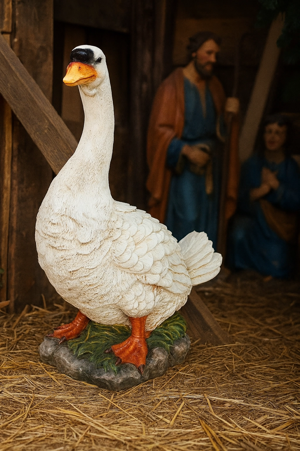 Ustvarite prepričljivo praznično sceno z realistično figurico gosi 51 cm, ki odlično dopolni jaslice, izložbo ali tematsko postavitev. Dovršena struktura perja, oranžen kljun in noge ter naravni podstavek z motivom trave delujejo avtentično in estetsko čisto.