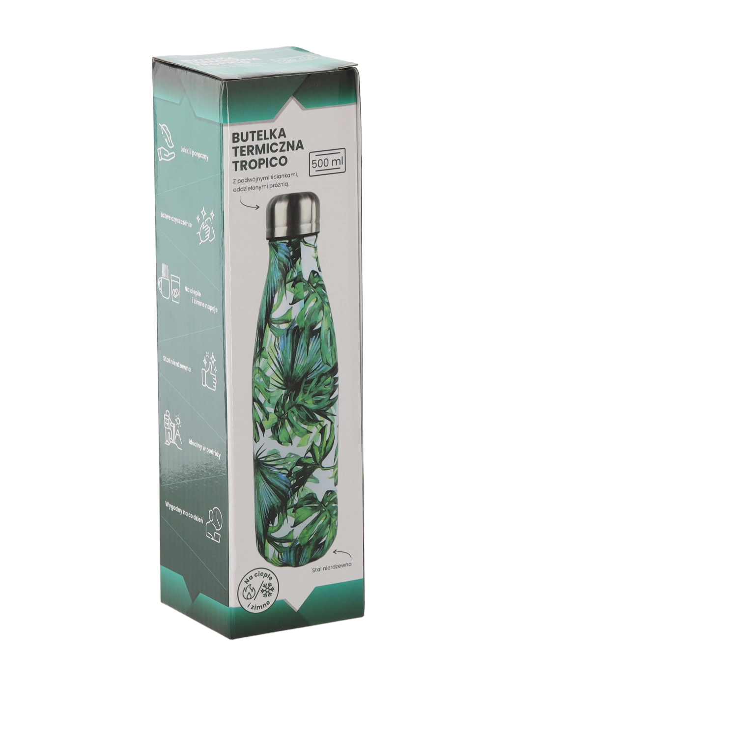 Dizajn s tropskimi motivi doda vsakodnevni hidraciji pridih sloga, ne glede na to, ali ste v pisarni, v šoli ali na izletu. Steklenica je okolju prijazna in večkrat uporabna – zmanjšuje porabo plastike za enkratno uporabo in pomaga varovati okolje.