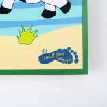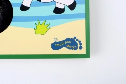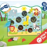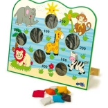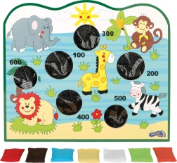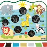 Igralna deska z barvitimi ilustracijami živali in barvnimi vrečkami naredijo igro privlačno in zabavno za otroke.