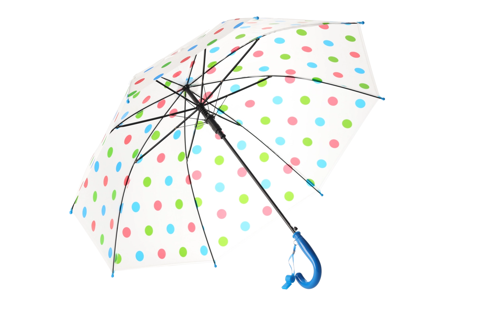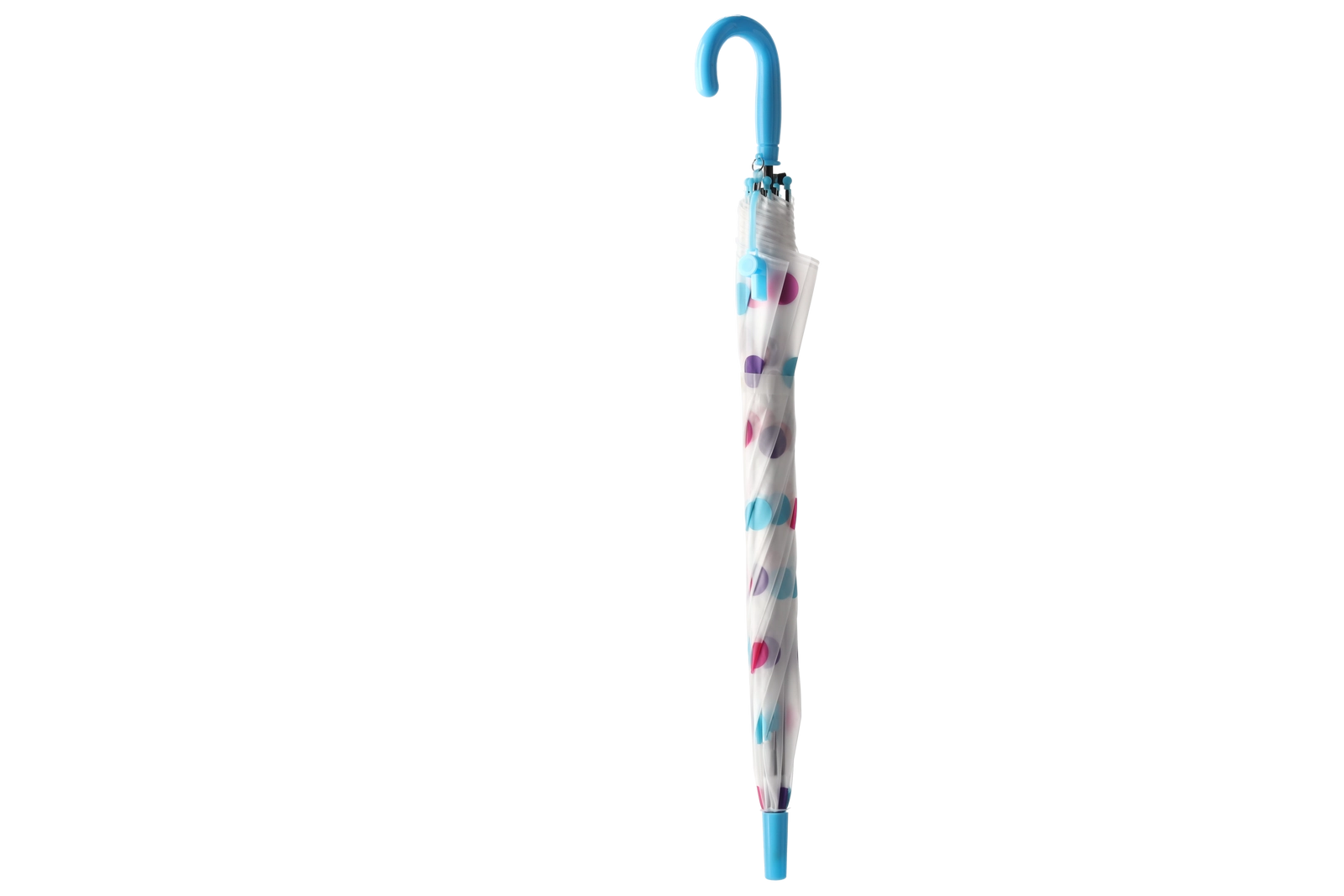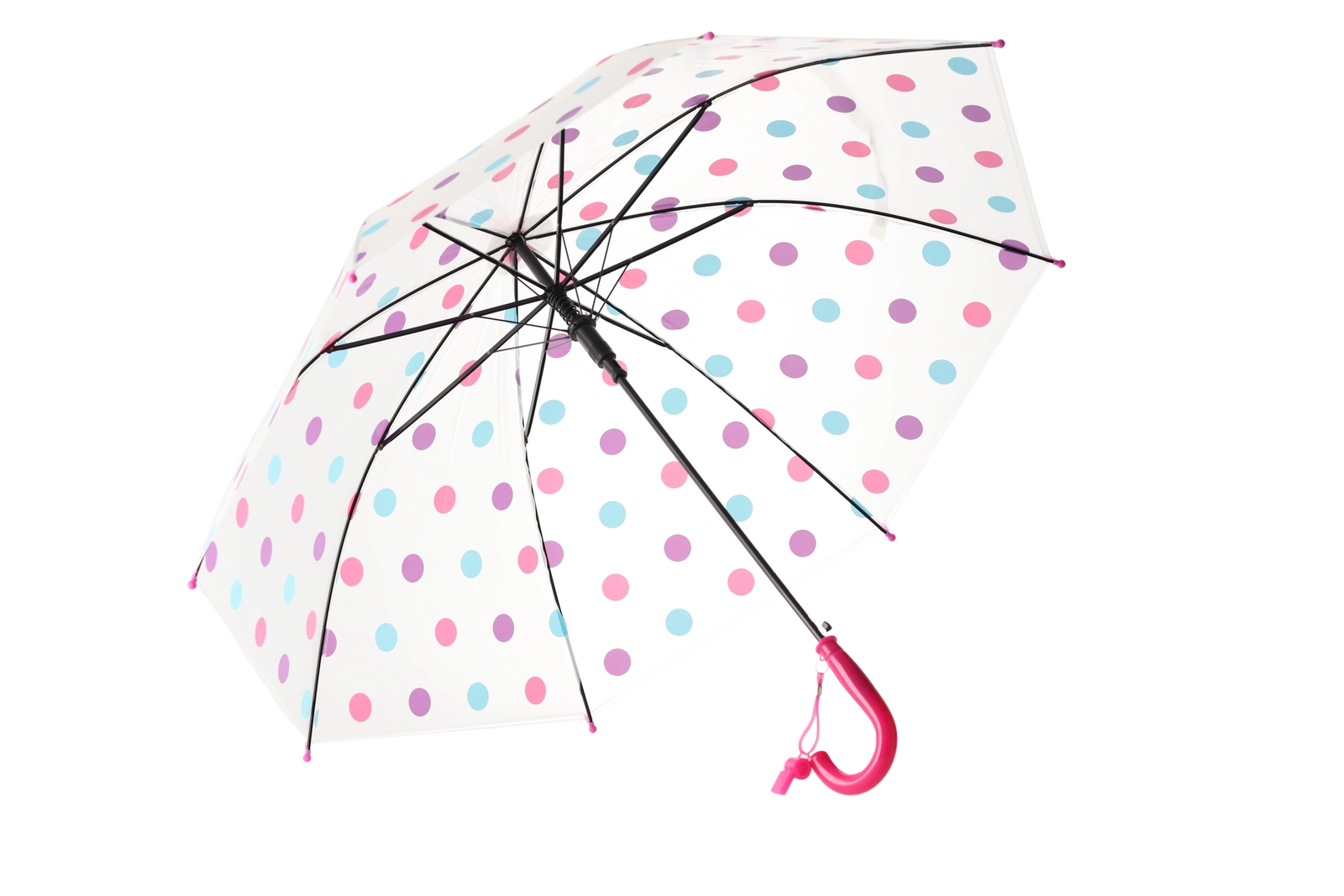 Stilski prozoren baldahin z večbarvnimi pikami se ujema z različnimi outfiti in hkrati izboljša pregled nad okolico med hojo v dežju.