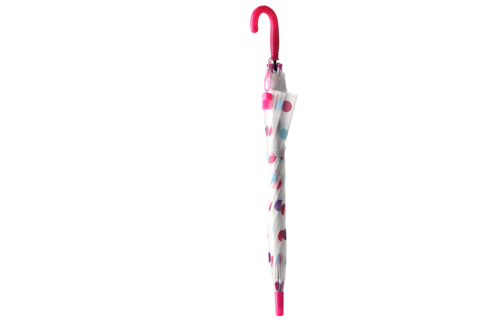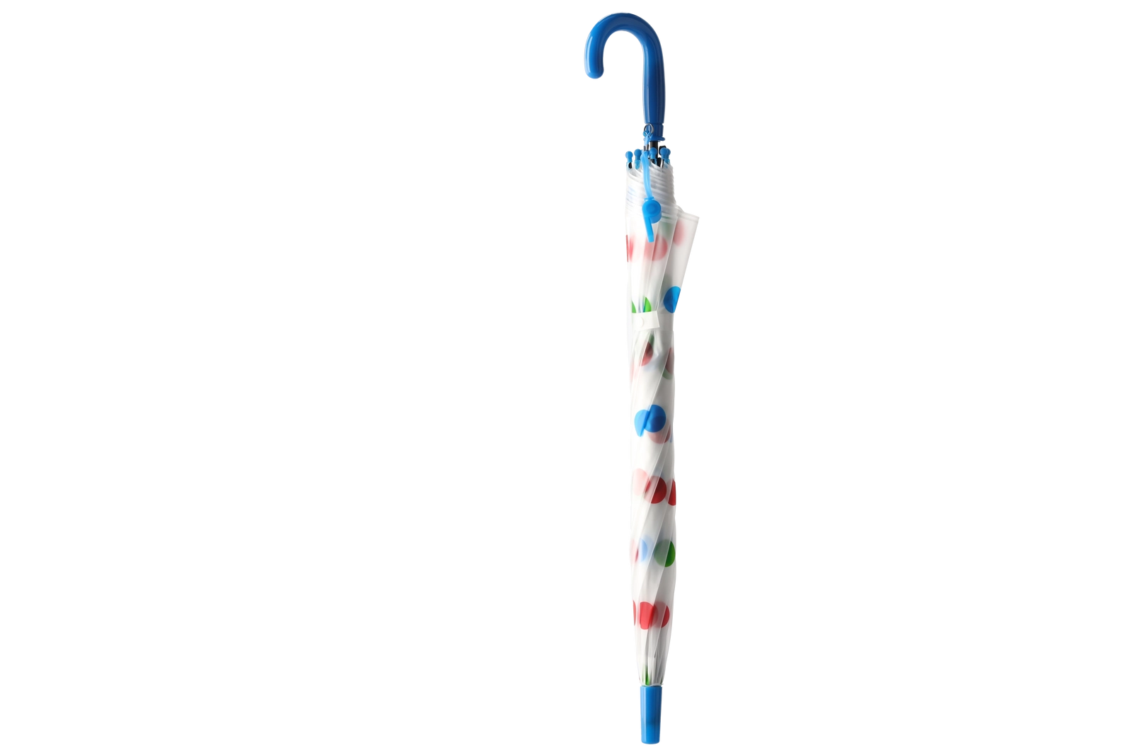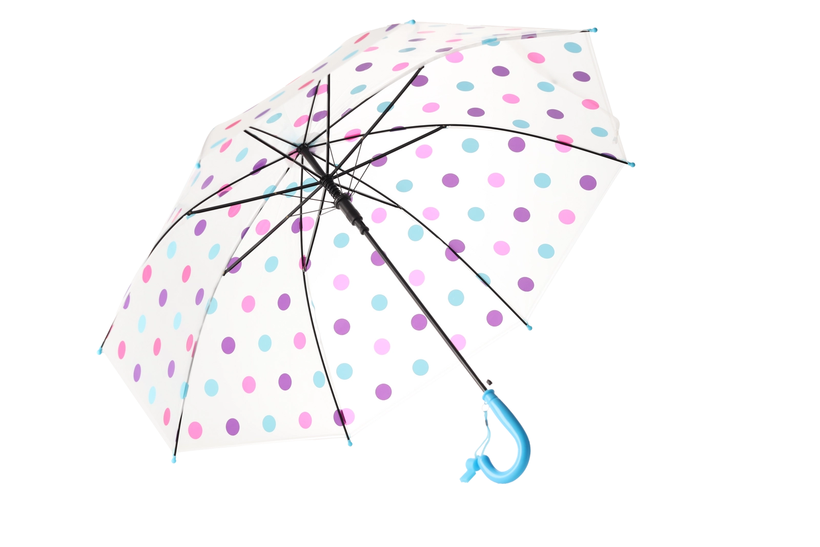 Stilski prozoren baldahin z večbarvnimi pikami se ujema z različnimi outfiti in hkrati izboljša pregled nad okolico med hojo v dežju.