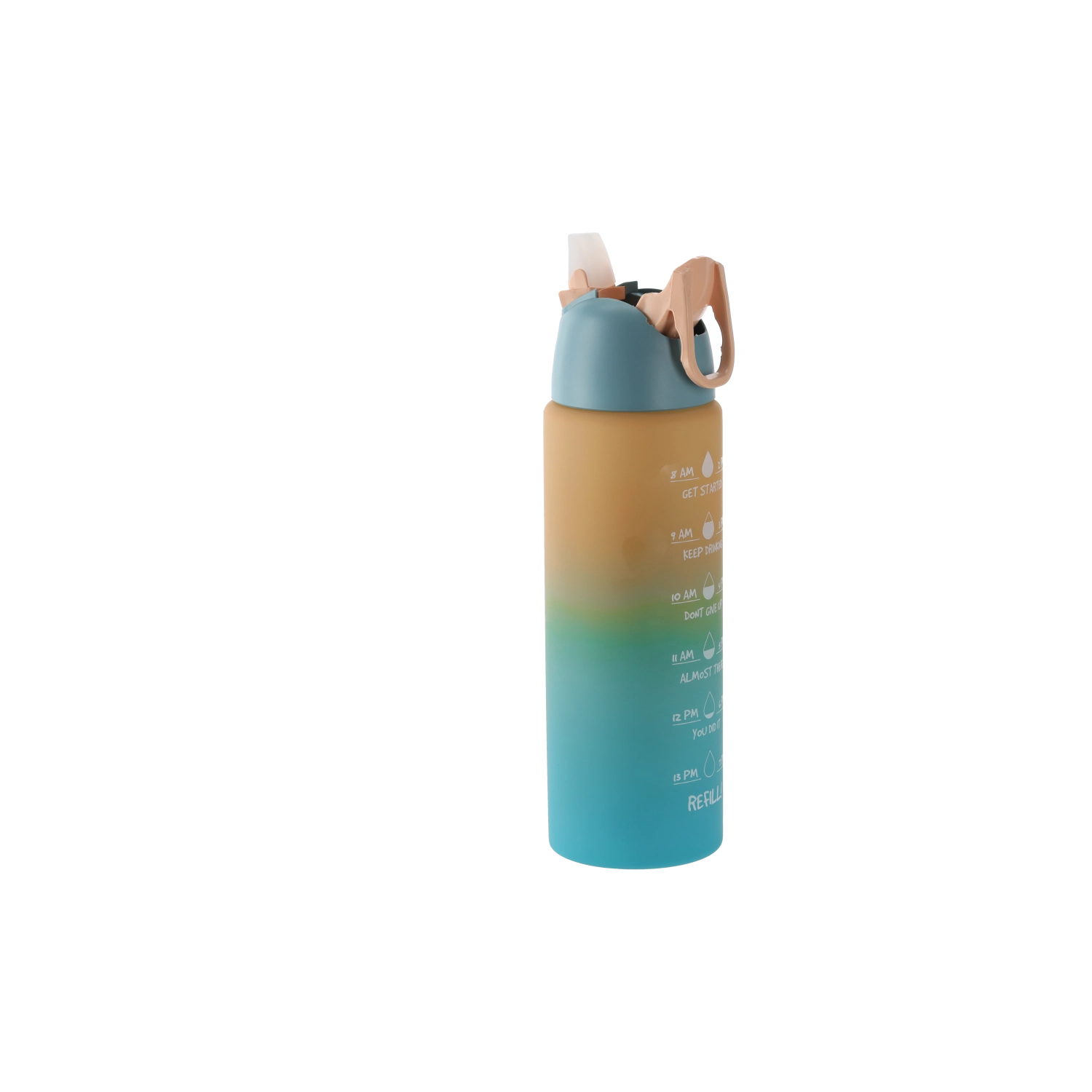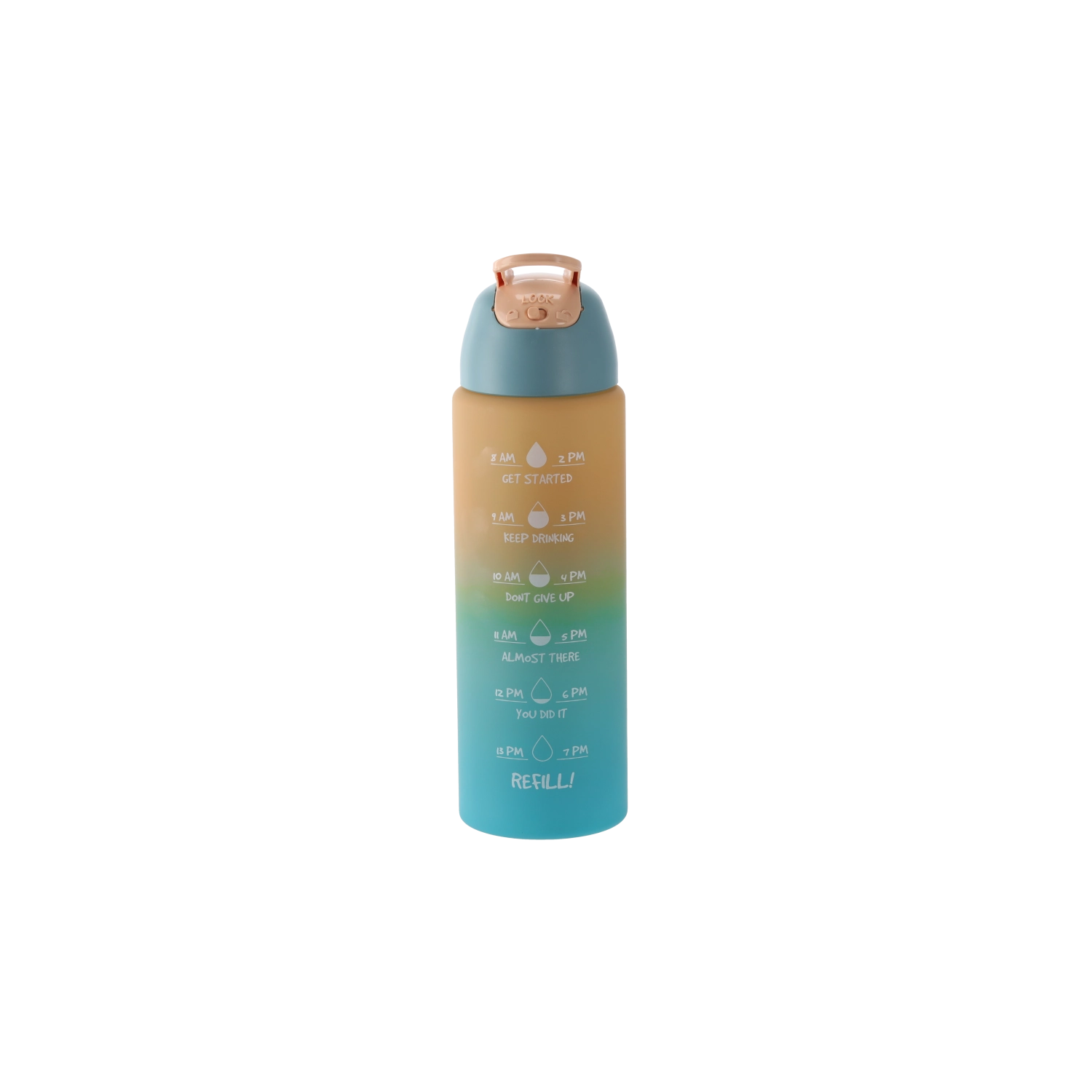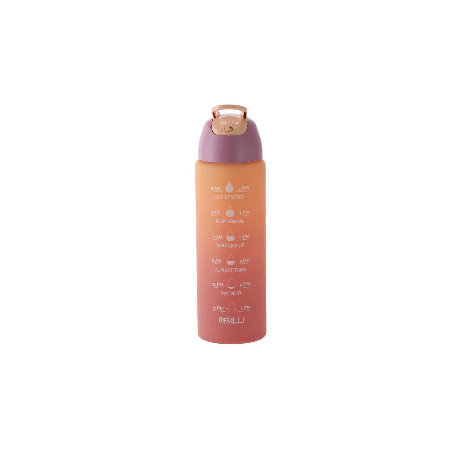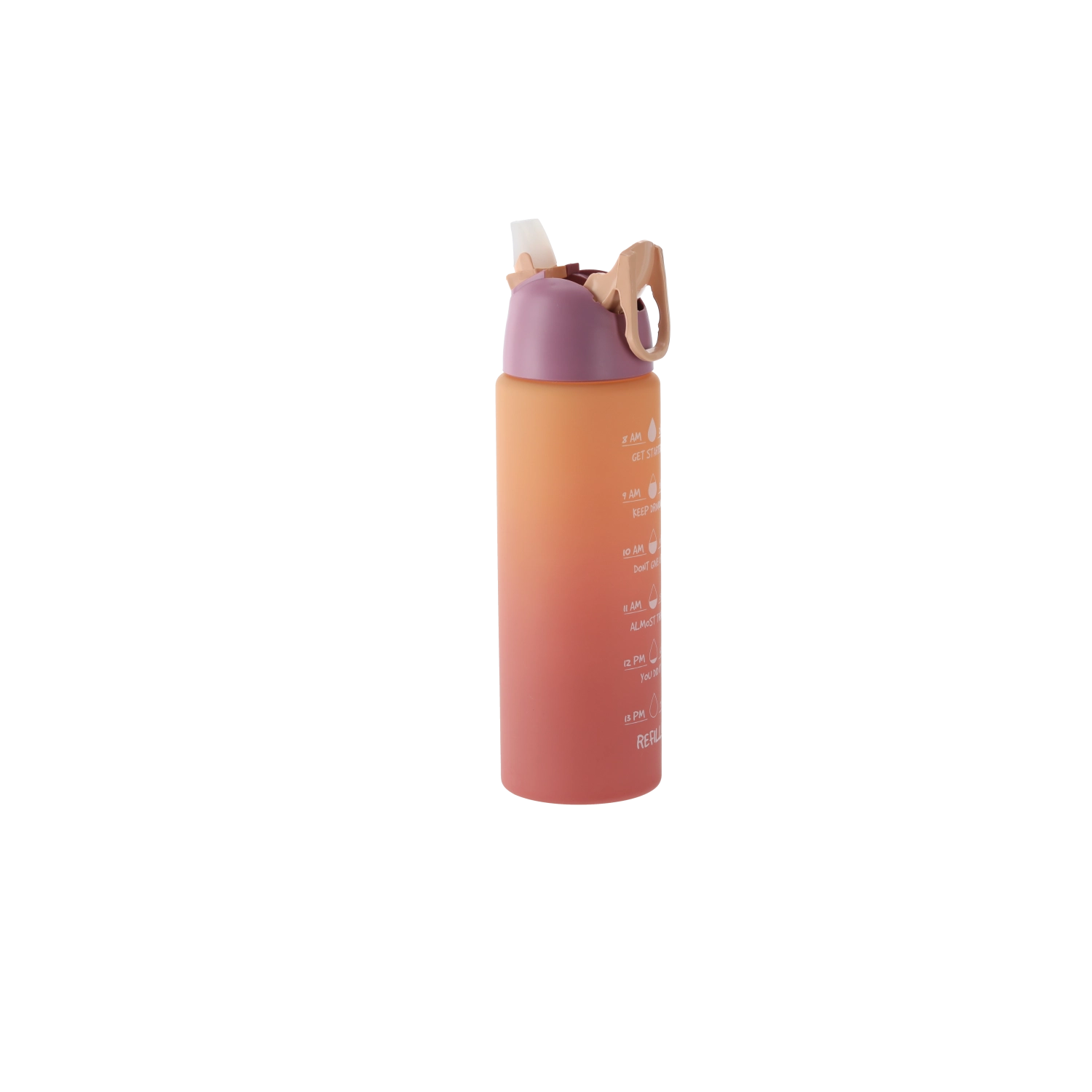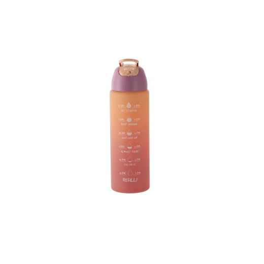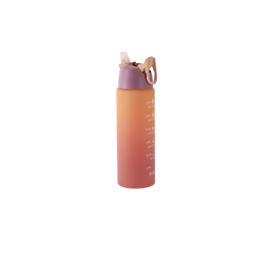 Stilizirana steklenica z ombre prelivom v rožnato-oranžnih odtenkih združuje sodoben dizajn in funkcionalnost. Telo iz trpežne PC plastike je lahko, primerno za na pot, in zasnovano tako, da se udobno prilega držalom v avtomobilu ter stranskemu žepu nahrbtnika. Integrirane časovne oznake ob strani vas motivirajo k rednemu pitju čez dan.
