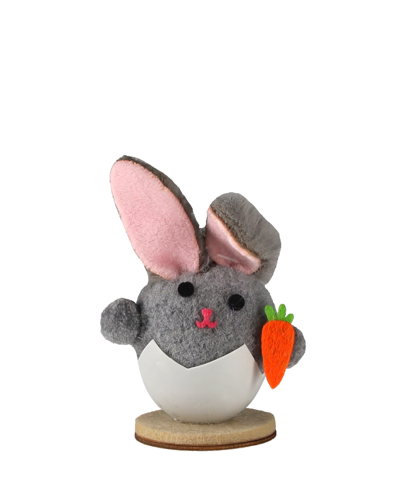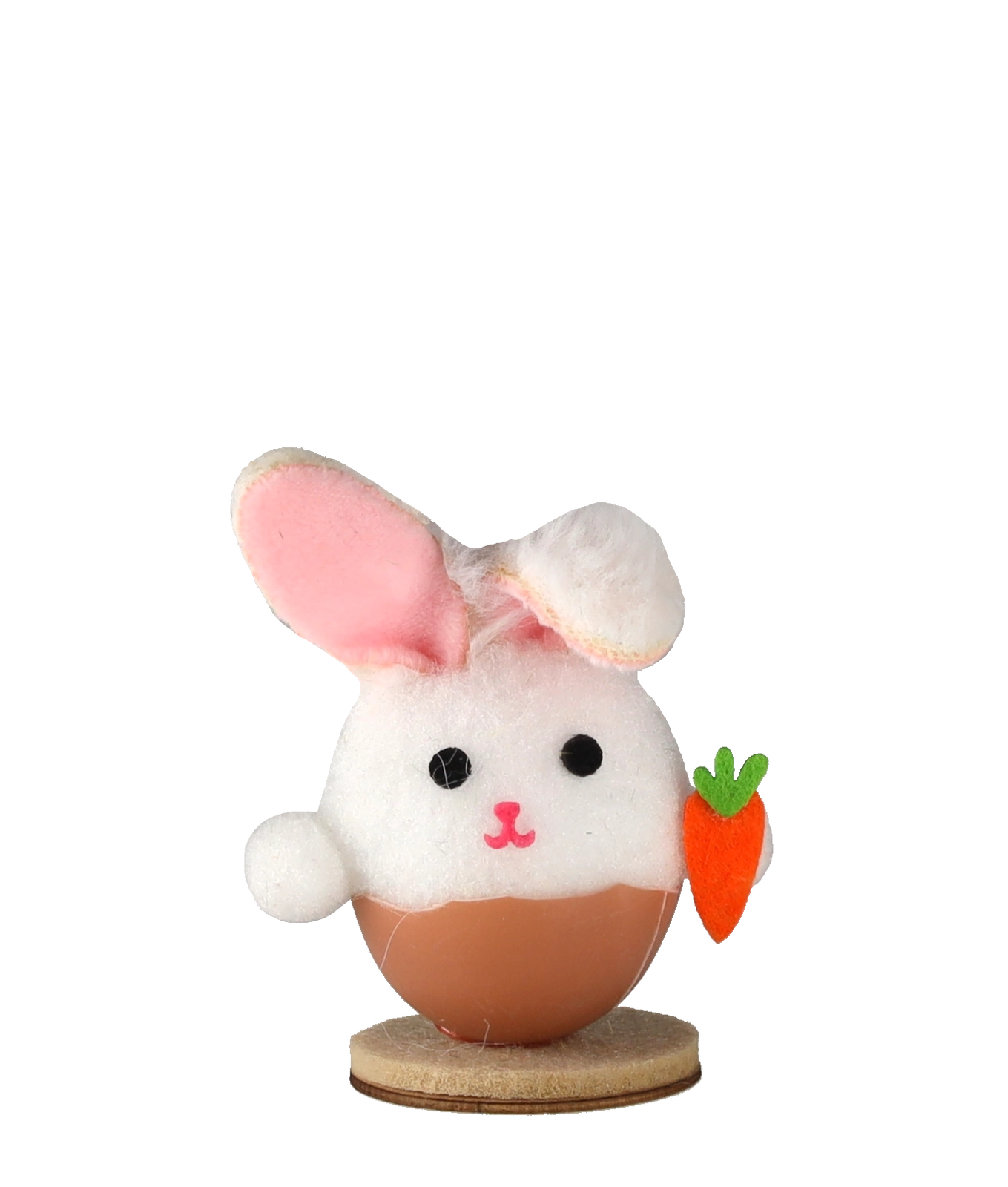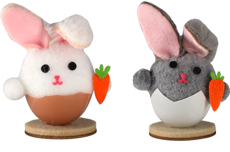 Ta ljubka velikonočna dekoracija prikazuje zajčka, ki kuka iz jajčne lupine – simbola novega življenja in pomladi. Nežne barve, mehak tekstilni otip in realistični detajli (gobček, ušeska, korenček) jo naredijo za očarljiv dodatek vsakemu interierju.