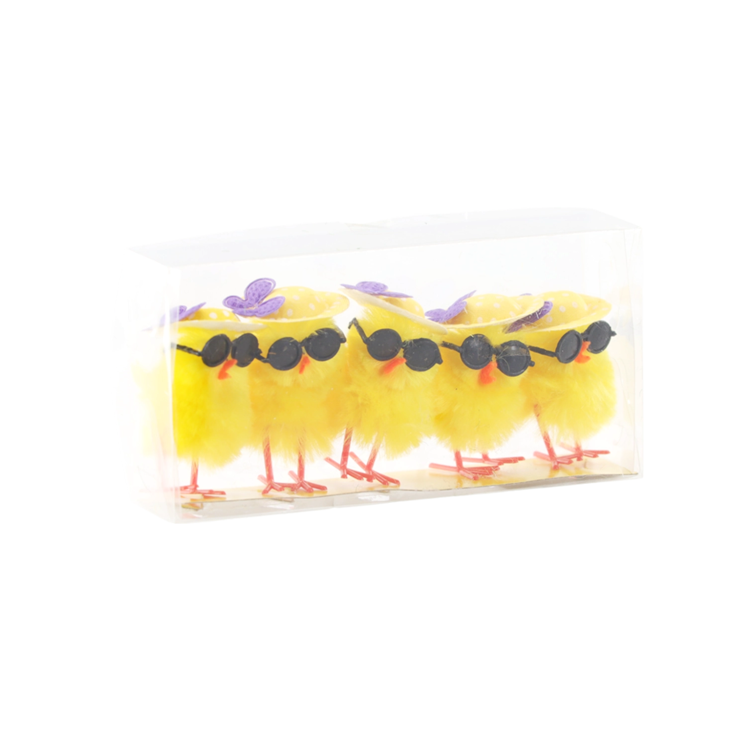 Komplet petih velikonočnih okraskov v obliki piščančkov s sončnimi očali in kontrastnimi dodatki prinaša v prostor veselo, svežo atmosfero. Lahka plastika z puhastim učinkom deluje na pogled in dotik igrivo, hkrati pa je trpežna za ponavljajočo uporabo.